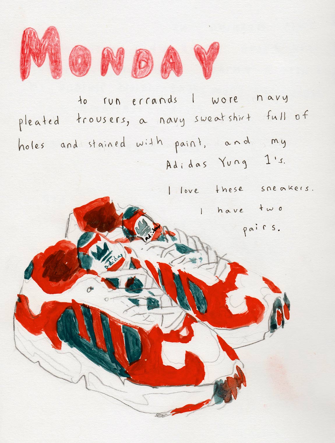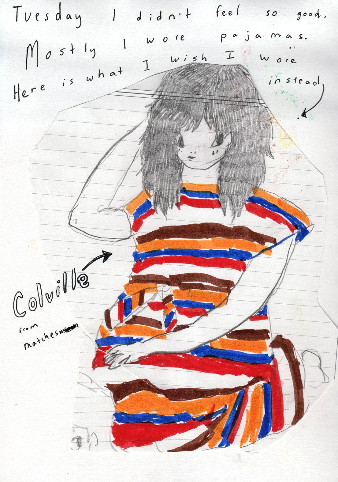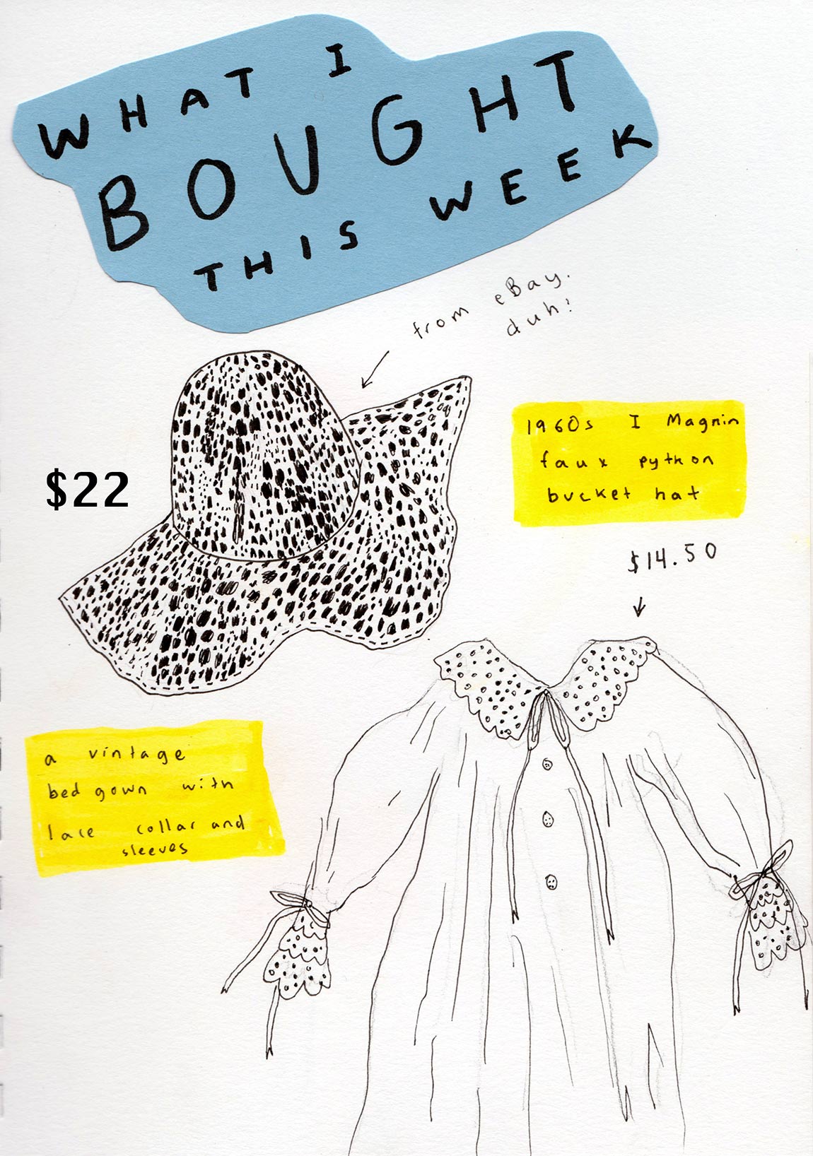 I have been trying to keep up a sketchbook/journaling practice lately. I have been a daily journaler for years now, but since I have been doing so much artwork I wanted to do a more visual diary. I have also been trying to buy less, and spend more time appreciating what I already have. I am not immune to the draw of beautiful new clothes and shoes (as this diary shows!). But I do consider this journal a little thank-you note to all of the clothes I wear on my back (and the shoes my feet) and the ways they serve me in my life. This fashion sketchbook practice was a nice way to slow down and be appreciative of the present, through the good times (going to the museum, eating so much delicious ramen and watching wonderful movies) and bad (passing out on Saturday, sick day Tuesday…damned chronic illnesses). Maybe I should keep this up!