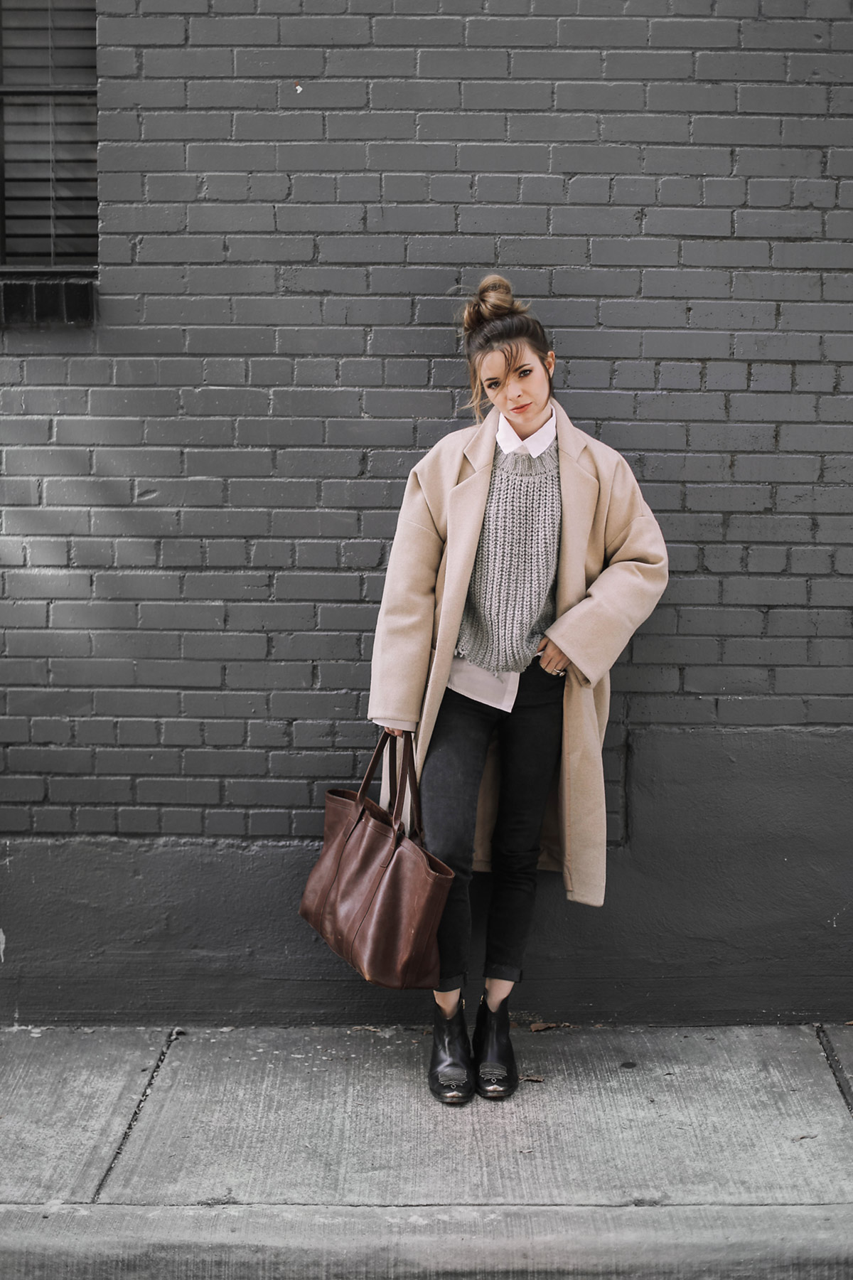 I am so in love with my coat, it is definitely a piece I will wear for many years to come. It reminds me of a sweater coat my mom has. Its a cable knit grey cocoon cardigan by MaxMara and she’s had it for probably 12 years. My mom is always lending this sweater to my sister, or me, or our friends. We never know where it is but it always returns home. I remember being out at a bar one night and seeing the familiar grey sweater draped over someones shoulders from behind. I tapped their shoulder and it was one of my sister’s best friends and I laughed. It’s like the Sisterhood of the Traveling Sweater! You’ve seen this sweater on Sea of Shoes a dozen times if you are a longtime reader, it is endlessly versatile. I can think of a few outfits I’ve posted with it off the top of my head. When I think about investing in a coat, I want to have the same kind of relationship with it that I have with the Traveling MaxMara sweater. That to me is what an investment piece should do for your wardrobe.