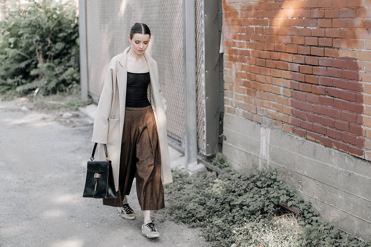 Second outfit I am wearing the Mara coat with vintage Perry Ellis culottes, vintage Gucci bag, and Golden Goose sneakers.