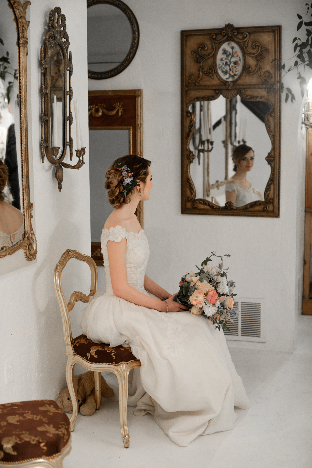 Here is a basic rundown of the steps for my hairstyle. I learned a lot of great tips and products from working with Danielle. We started off by setting my hair in loose barrel curls as a foundation. Danielle used the Matrix Style Link Heat Buffer and a 1” iron, wrapping my hair in a wand style fashion away from my face. She then pinned each curl with a clip until my hair cooled. Then, she used the Style Link Texture Builder at the base of the curls for density and grip, released the curls and used a comb to separate the texture. Next, she sectioned my hair in a side part and started twisting and braiding multiple sections from the sides of my face, and separating the lower half of the back of my hair into a braided low bun. She spent a LOT of time playing with the twist and braids with her fingers, pulling them looser and giving them texture for a more undone look. She used the Style Link Style Fixer for a strong hold and shine to make sure the look would last all day. We finished with a comb adorned with flowers that matched the floral arrangement in our ceremony. Then my sister helped me into my dress (!!!) and I was ready to walk down the aisle.