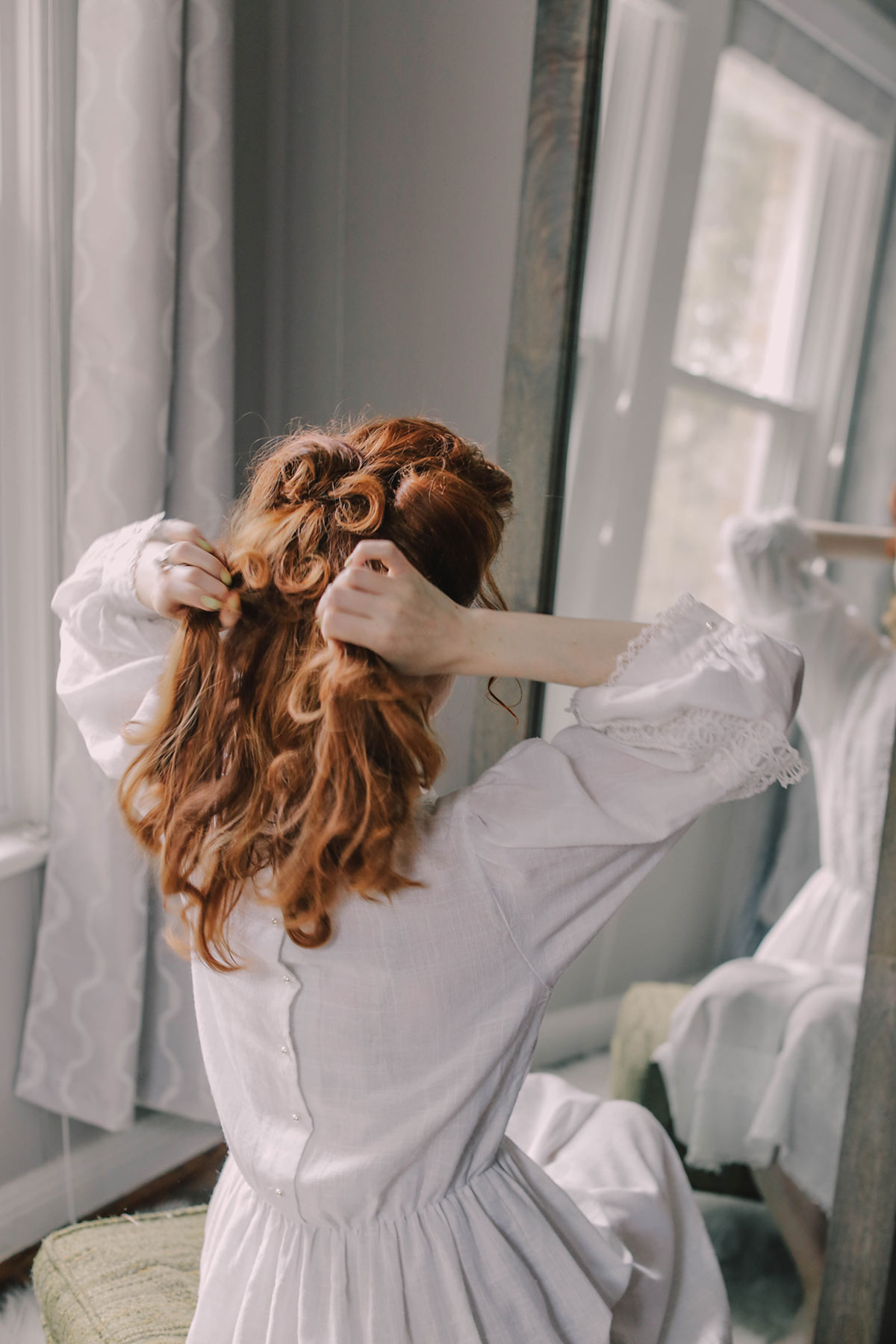 Note: You will notice I use a hair styling tool called “hot sticks”. These are my go-to styling tool for any kind of vintage hairstyling. They are great for creating hairstyles from the 1700’s all the way through the 1940s. They are little rubber rods that you wrap your hair around and attach together at the ends. They create very tight curls and a ton of body in the hair. If your hair does not hold curl well, these are a great styling tool. If you have any interest in vintage hairstyling, I definitely suggest buying some hot sticks. You can get them from Babyliss or Conair. I use the Babyliss Hot Sticks here. I like these better than the Conair hot sticks because the Babyliss has 20 rather than 14 rollers. I have hair that doesn’t hold curl well, so the more rollers the better for me. When you plug hot rollers in, allow at least 15 minutes for them to get hot.