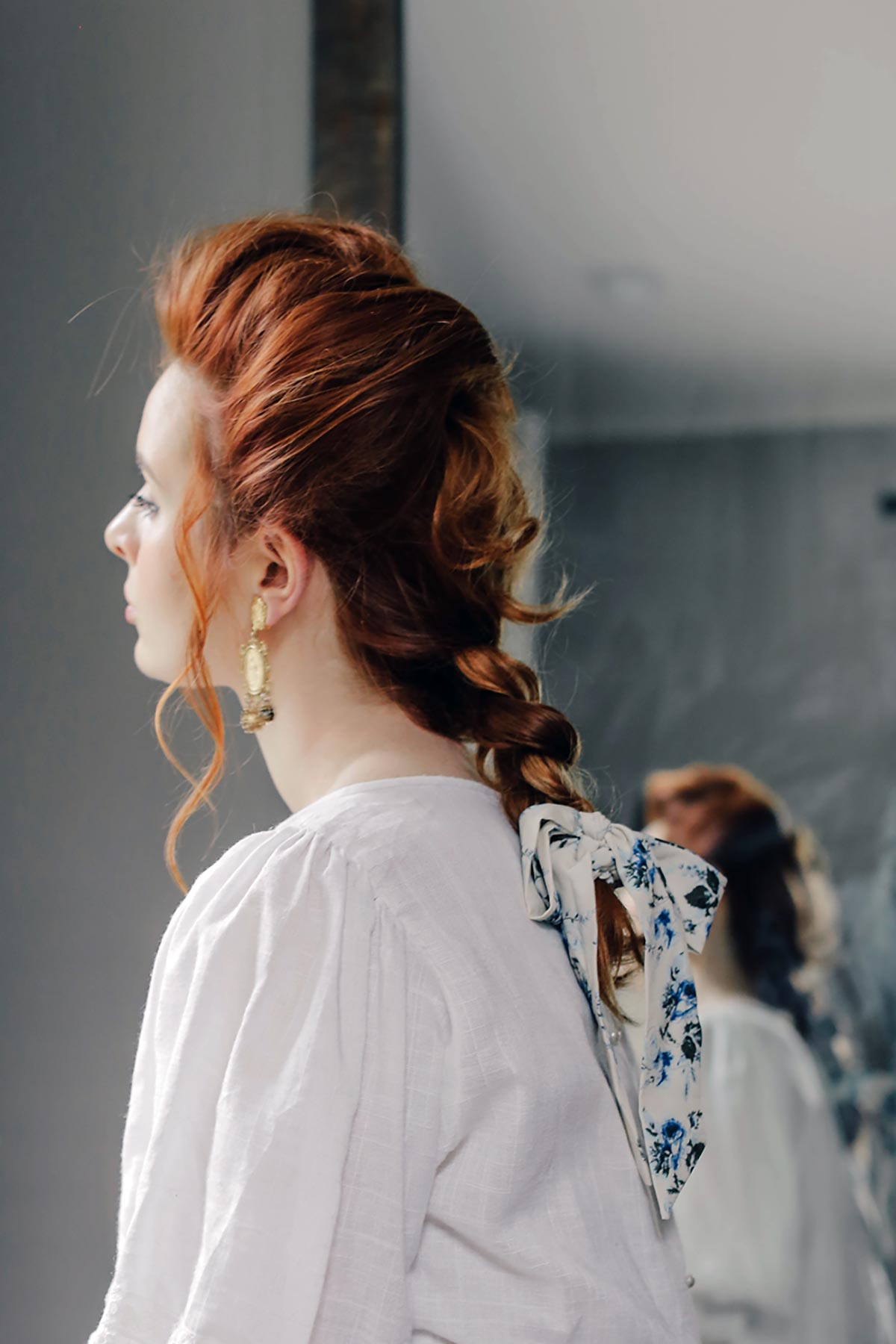 6. To finish the style, take the back section of hair and braid it into a low back braid. Fasten with an elastic or a scrunchie bow (the bow I am wearing is from the Laura Ashley for Urban Outfitters collection). Pull the braid loose by gently tugging on the braid for a more relaxed look.