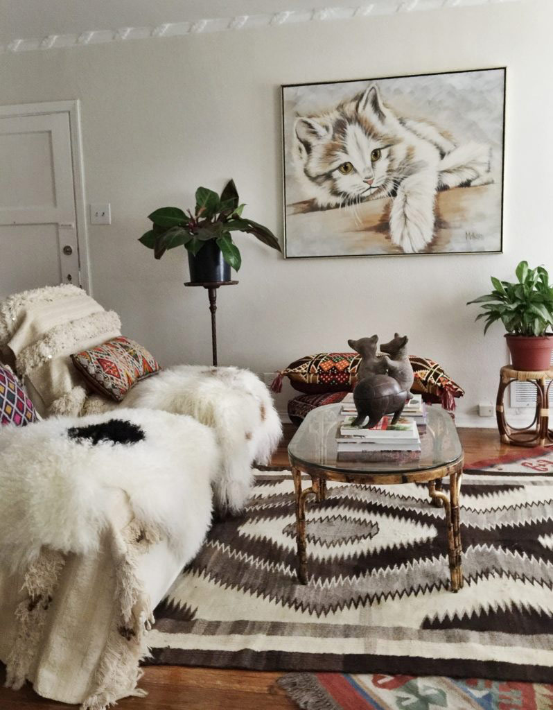 If you want a low-maintenance, low-commitment rug situation, go for something cheap and new, because if it gets destroyed you won’t have a meltdown about it. I was a little worried about buying a nice rug because of my older dogs, so I decided to go for a $125 rug from Home Depot. It looks pretty great and I don’t have to live in dire fear of stains if my senior chihuahua tee-tees on it. If there’s a will, there’s a way!