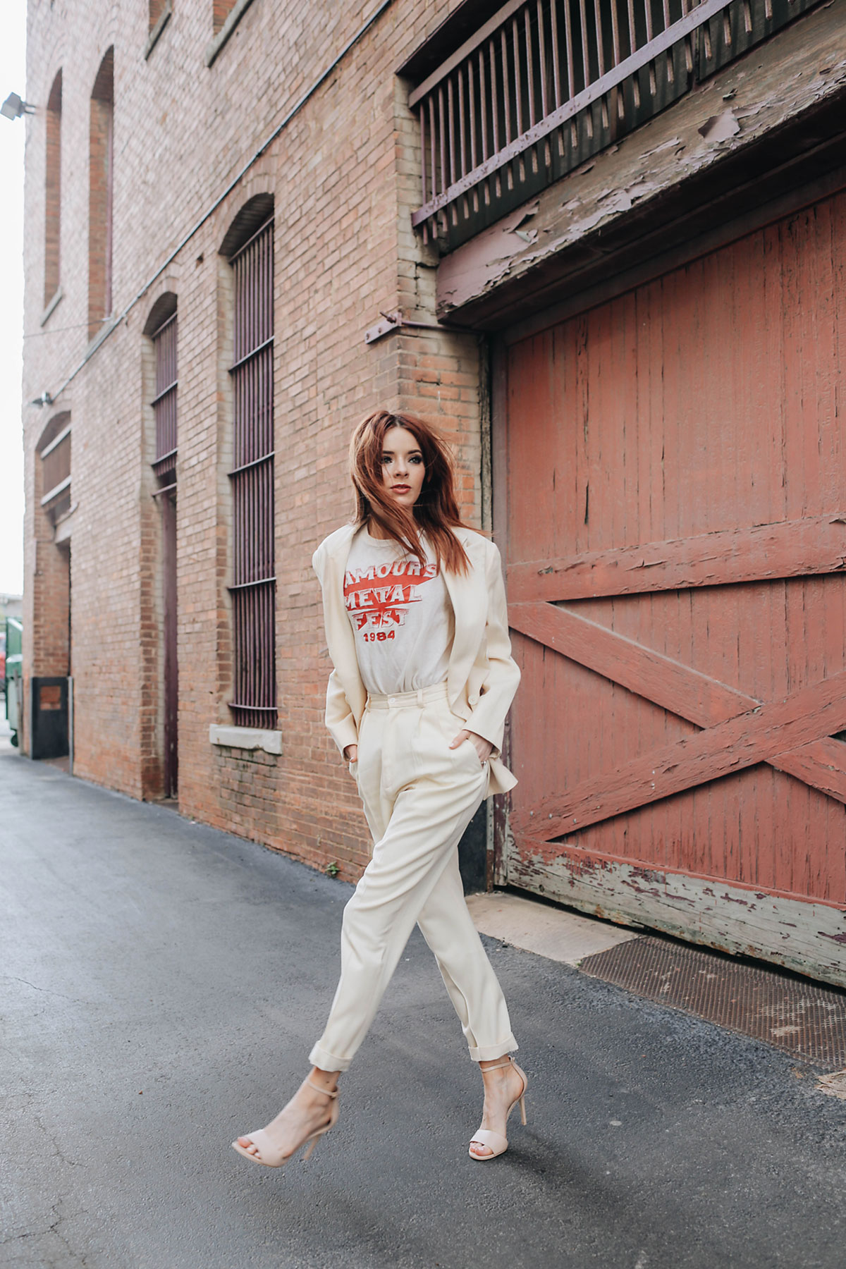 A good nude shoe is a must-have in my wardrobe, especially as the weather is warming up and I’m getting ready for summer. It’s a no-brainer, fail-safe shoe option for paring with neutrals. I love this Aldo sandal that’s available at DSW Designer Shoe Warehouse. I’m wearing it with a cream linen suit and a rock and roll tee. It makes a tomboy look sleek enough to wear for an evening out. I was so glad to find the perfect shoe to wear with my favorite suit. I also love nude shoes with miniskirts and dresses in the summer because they can give the illusion of mile long legs! It’s a styling trick you see a lot of celebrities using lately. No matter how you style them, it’s hard to go wrong with a classic sexy heel.