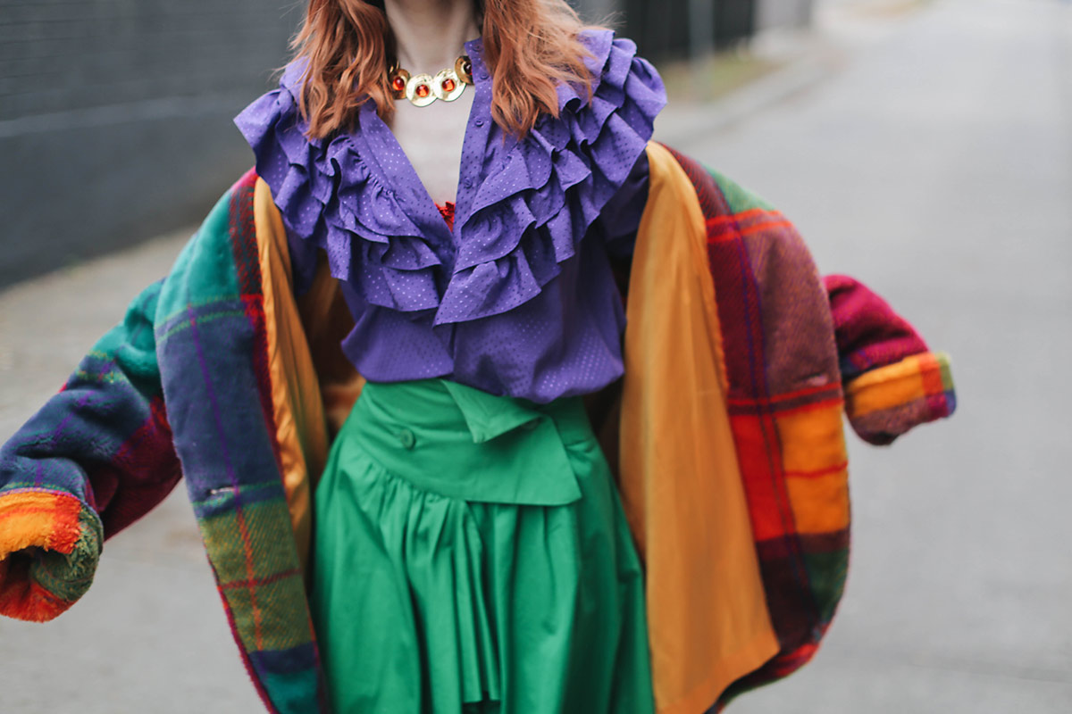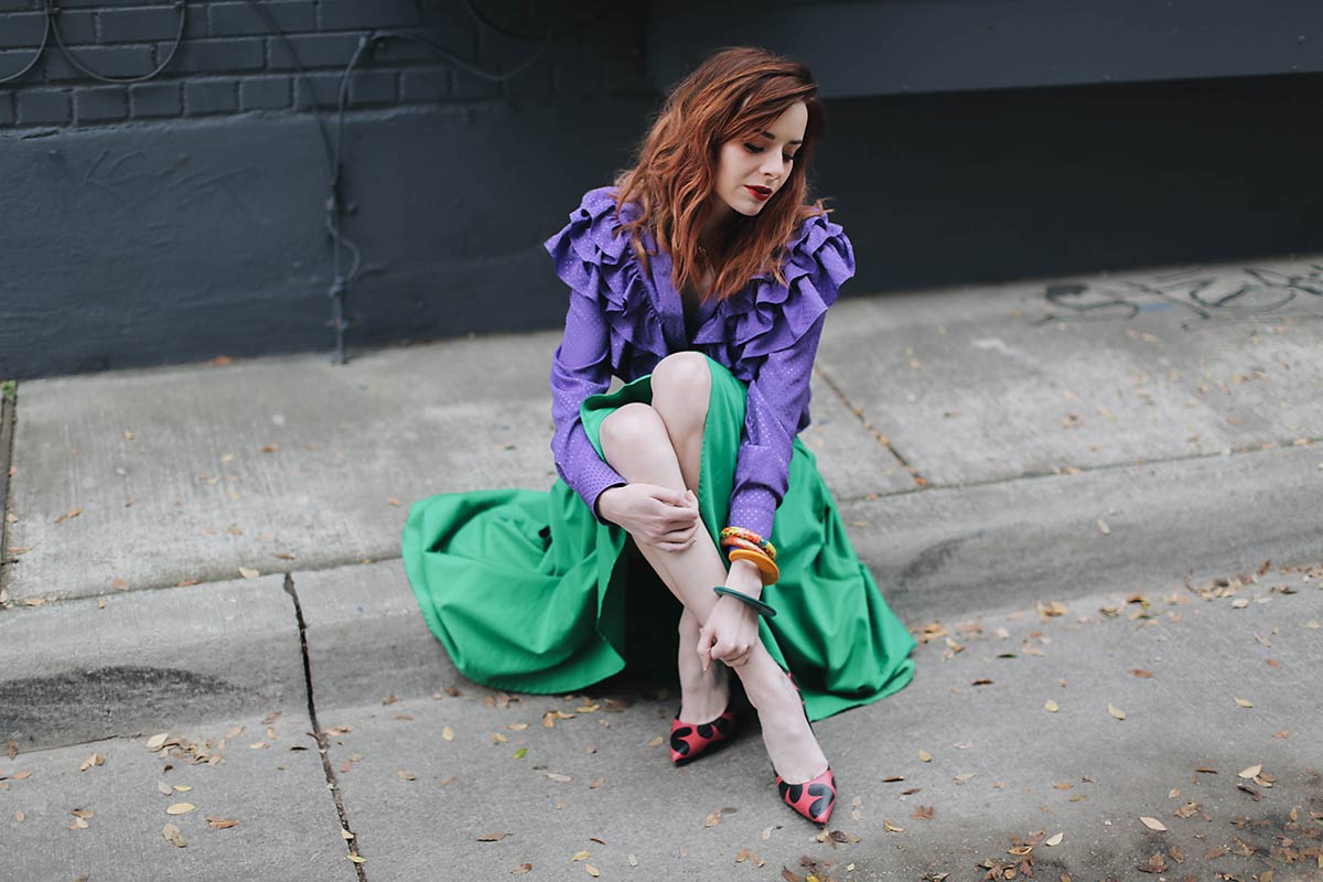I picked up this blouse from & Other Stories while in Paris. My eyes were immediately drawn to the color. Purple is one of my favorite colors to wear and I loved the ruffle bib front. While dreaming up color palettes I knew that this purple blouse would pair fantastically with a vibrant kelly green. I got this 80’s skirt from one of my favorite vintage sellers over the summer. The purple and green made for a fun pairing. A red lace bra from Agent Provocateur was a cheeky way to bring in some more color.