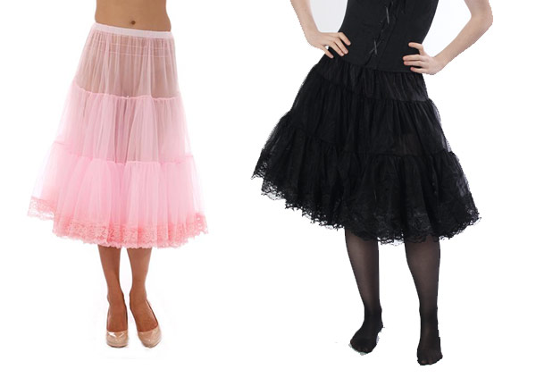 Malco Modes has been making petticoats and undergarments since the 1920s and their petticoats are all handmade in the USA. This is a company that knows petticoats, and if you search for 50’s petticoats you’ll find many vintage ones by Malco Modes. Malco Modes have a fantastic array of options to choose from, have adjustable waist sizes, and range from $40 and up. They have an array of styles to choose from, and I think the two best options would be the knee-length Zooey petticoat and the slightly longer tea-length Cosette petticoat. They come in a variety of colors. Fun and nice to support a business with roots in petticoat history! They even come with a mesh lingerie bag so you can wash them safely.