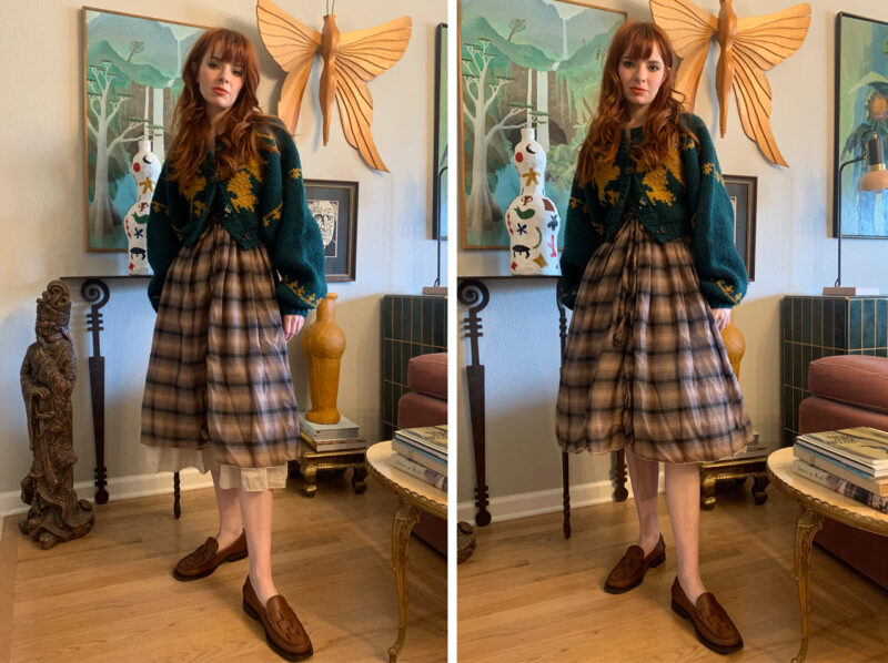 Wearing a CP Shades Julia dress with a vintage cardigan and Hereu loafers. I used my rust colored shorter crinoline underneath.