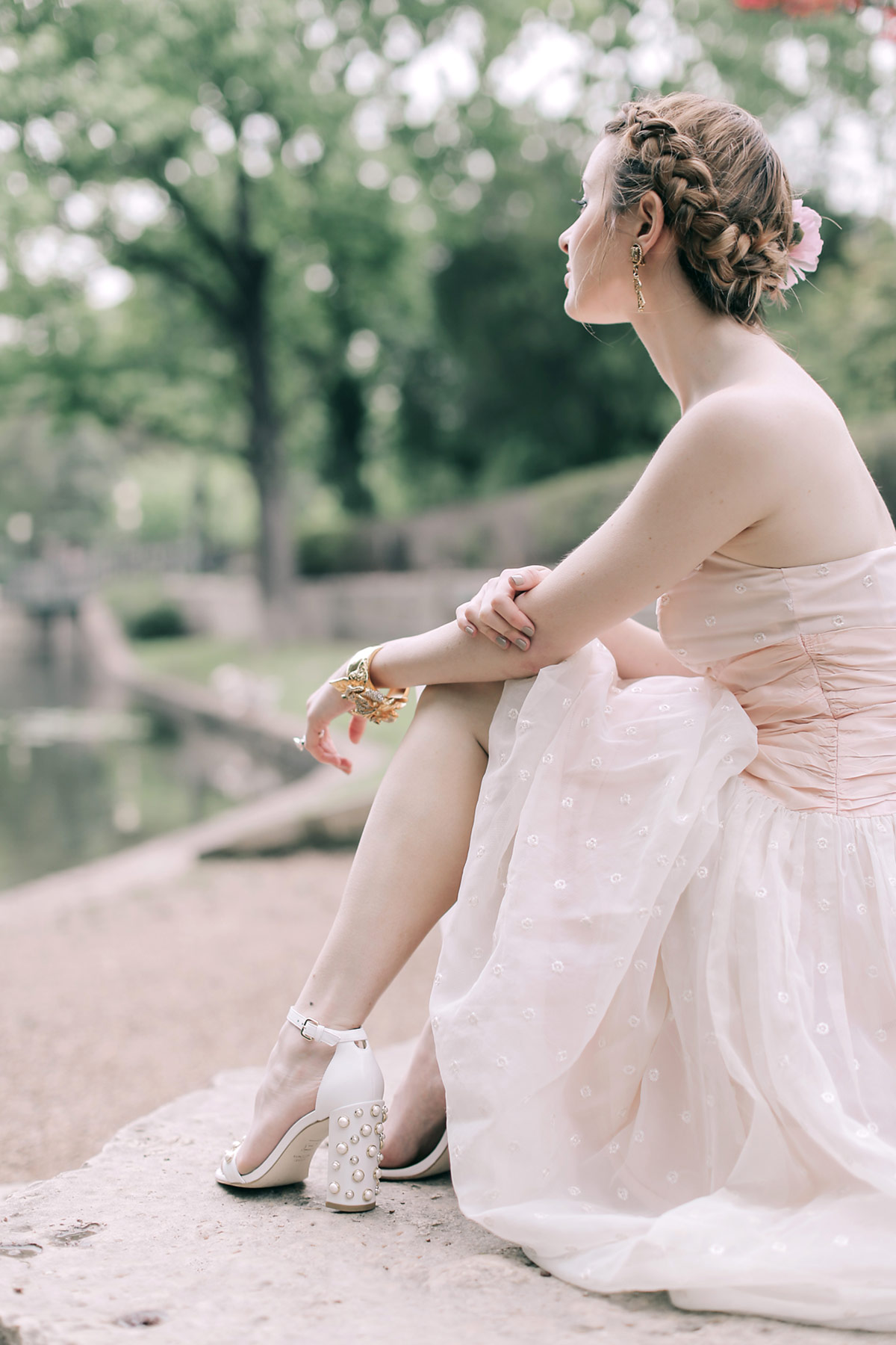 Those shoes are so pretty. Cool how the pearls match the spots on the dress. Though I don’t get how you can wear a strapless dress without the fear of it falling down. Also, braided hairdo is amaze.