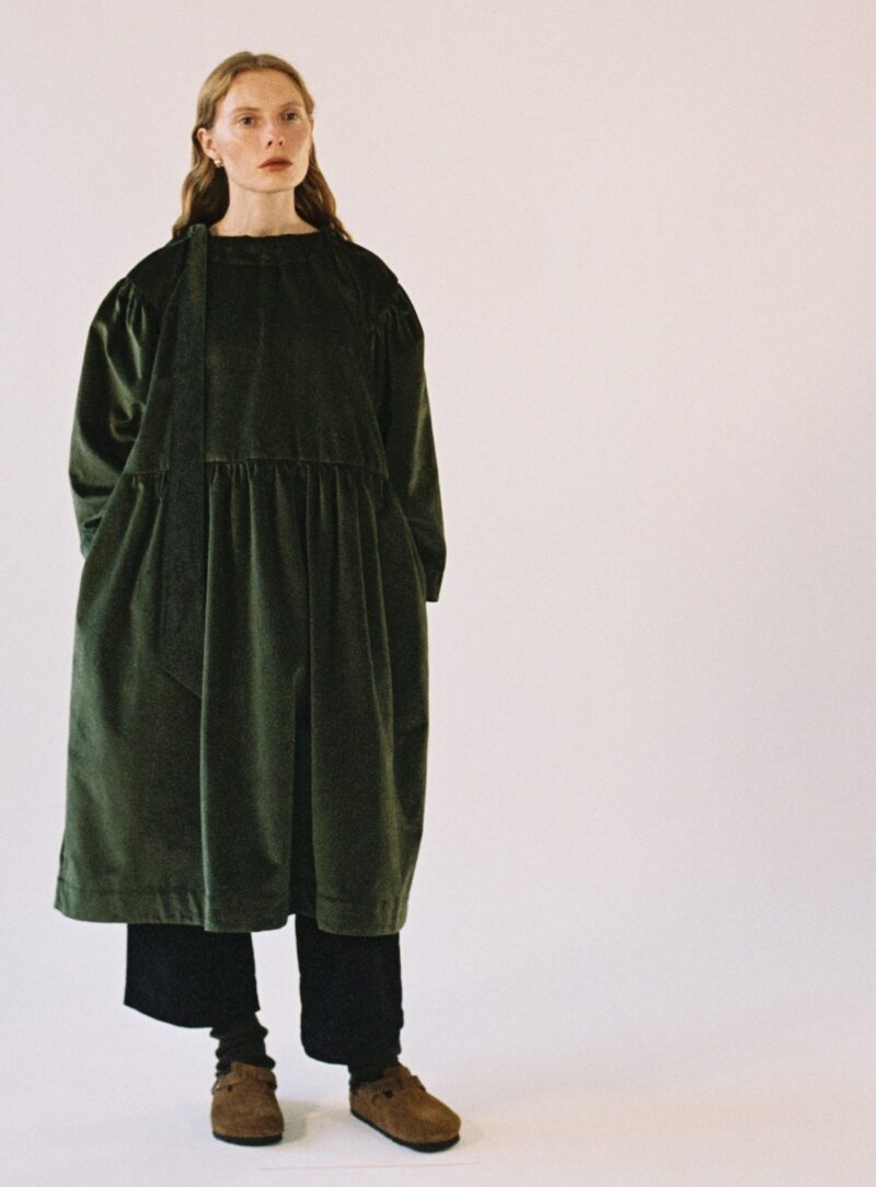 I discovered the brand Cawley while trawling Young British Designers online boutique and was bowled over by this gorgeous smock dress. This green velvet dress is exactly what I want to wear right now. I love the super generous shape and how they’ve styled it here with pants, socks, and clogs.