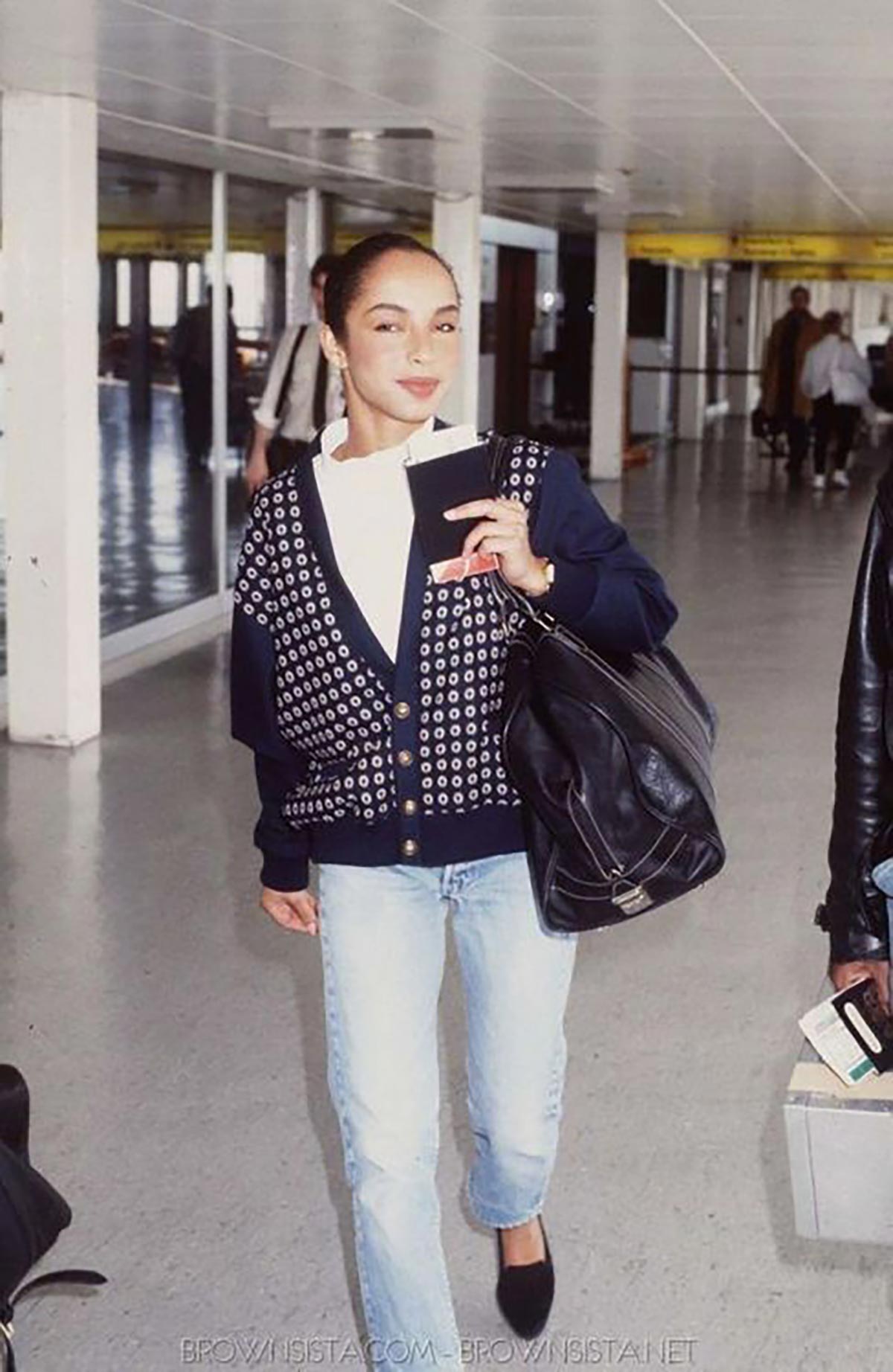 8. Sade in the best ever idea for an airport outfit: a preppy printed cardigan over a button up, classic Levi’s, and loafers with no socks.