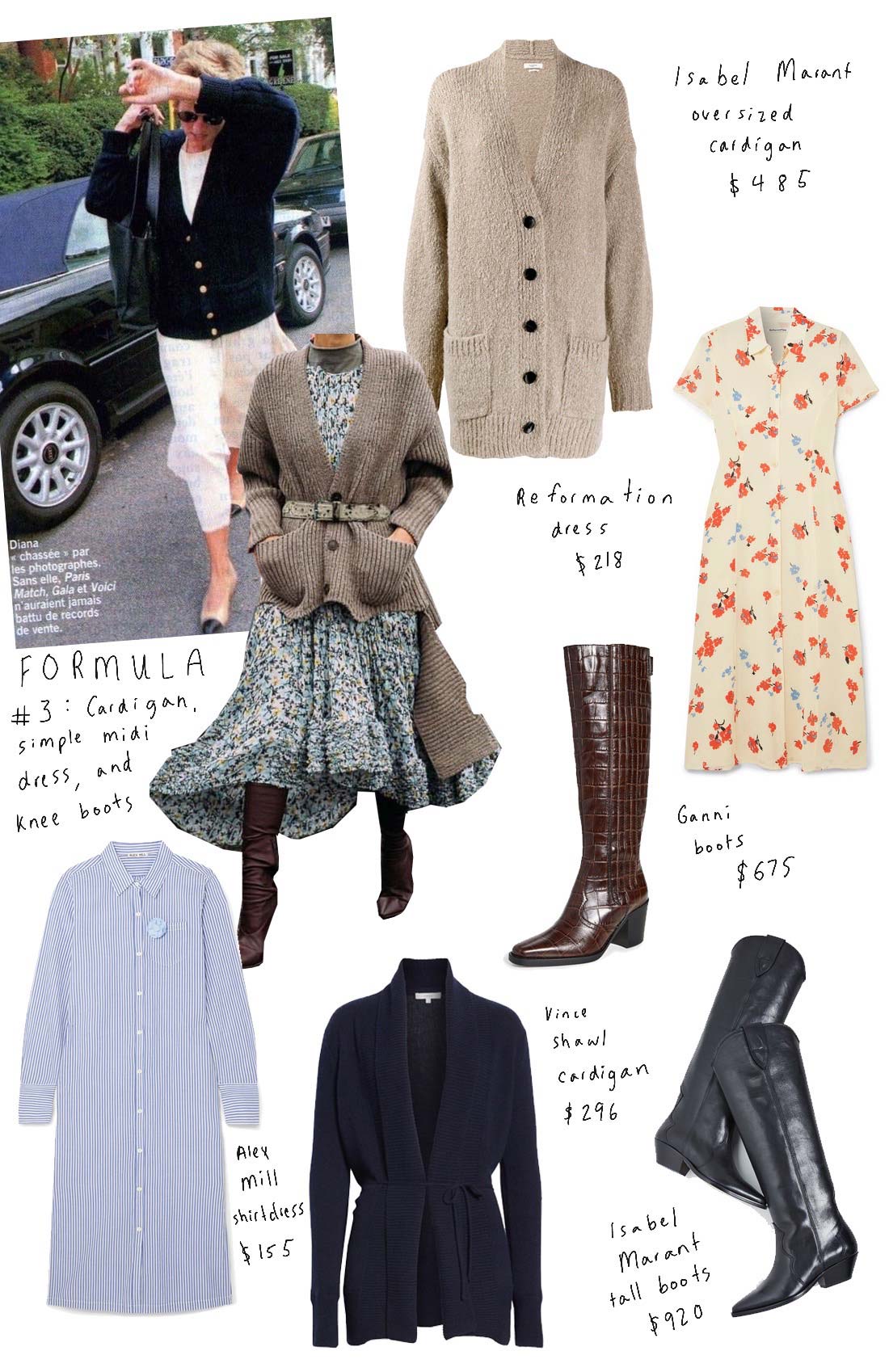 I have been obsessing on this picture of Princess Diana in a preppy navy cardigan over an ethereal white dress. It is one of the most chic outfits I have ever seen and I have been obsessing on pulling together some similar looks. The addition of boots make this outfit forumula fall-friendly, and some of the 80s inspired boots that are out right now would most definitely be Princess Di approved.