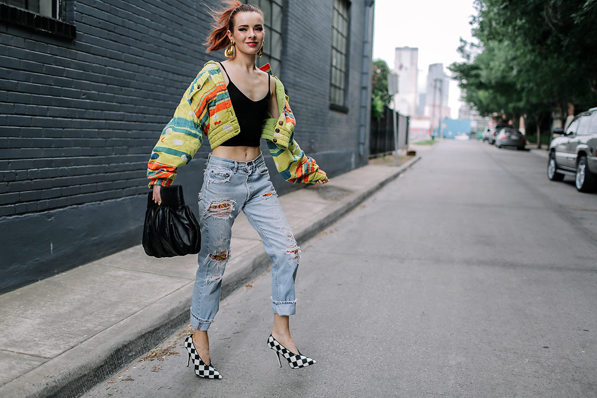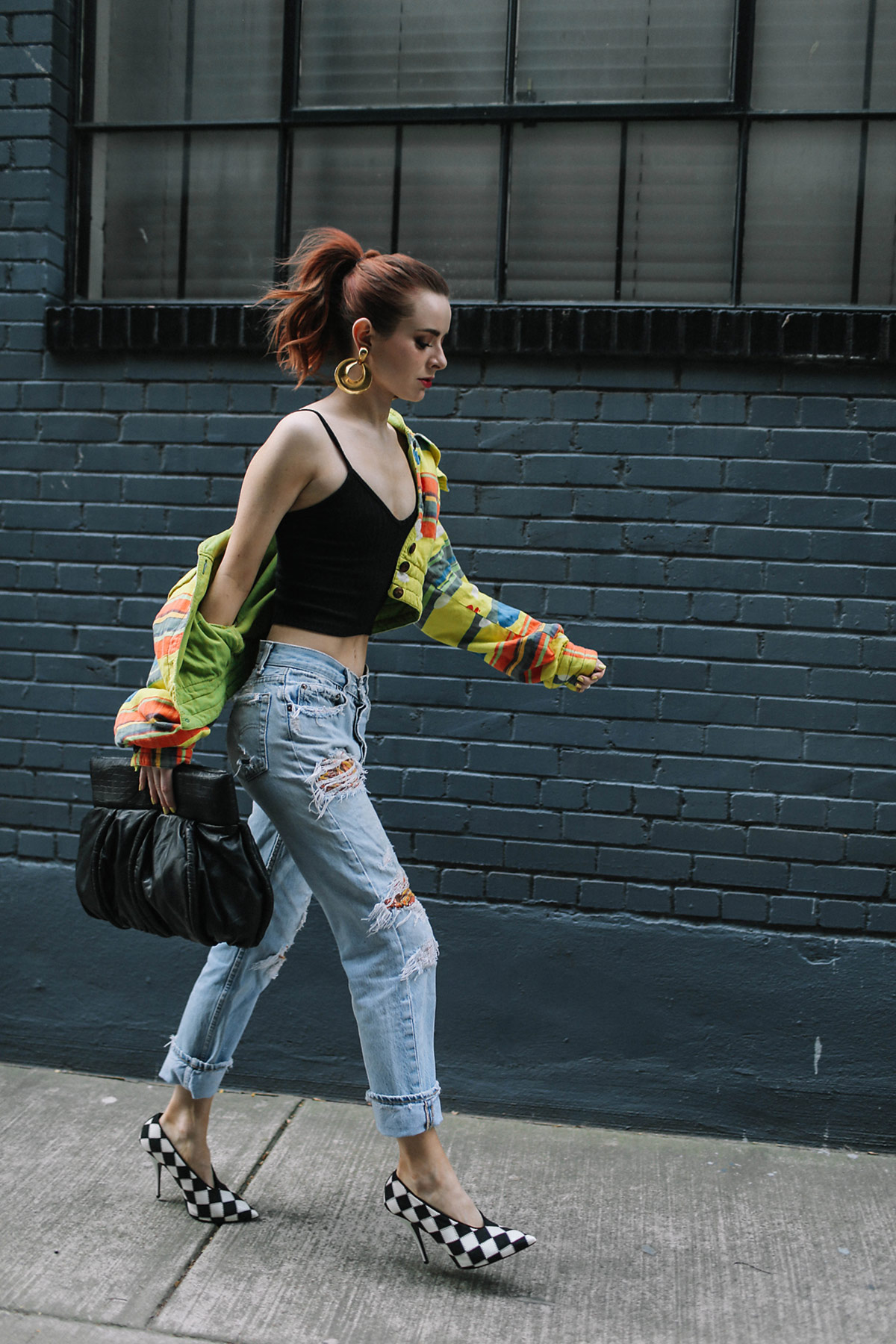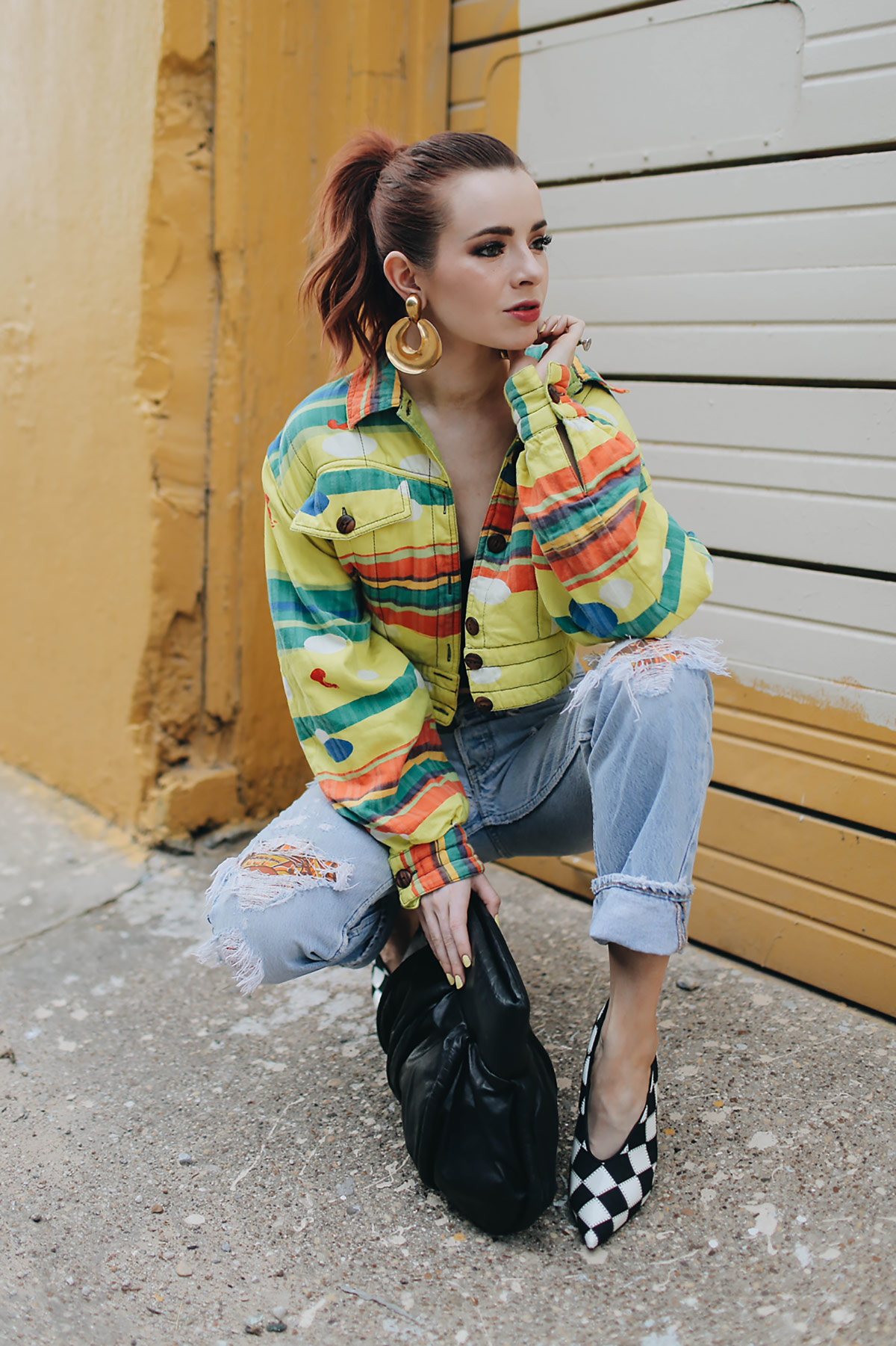 I love this look. The colorful jacket and fun checkered shoes go so well together.