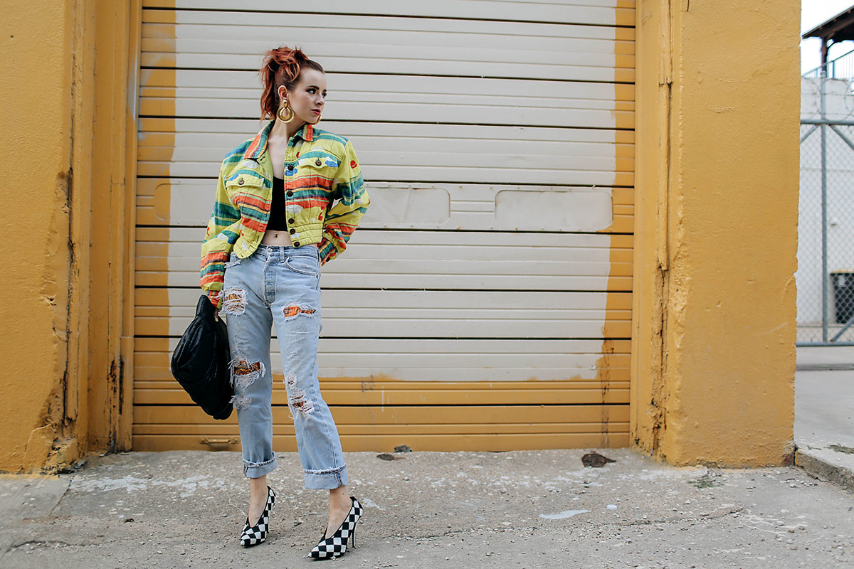I love this salute to the 80’s ! Great jacket and just love the checker board pumps!