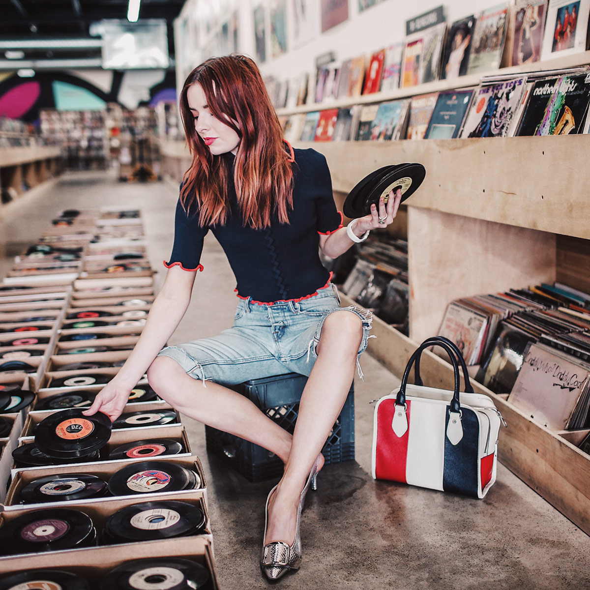 I am so obsessed with these cut-off Helmut Lang shorts I got on sale last week. They are so much fun to style because they look amazing with any kind of shoe and they pair well with all kinds of fun jackets. I have a lot of cropped 80s bomber jackets and boleros, and I can tell that I’m going to be wearing them with these shorts for a long time to come. What a fun length of denim! I wore them to go digging at my favorite DFW record store Josey Records yesterday. Worn with an Opening Ceremony ribbed crop sweater (also on sale right now) and Casadei silver python patterned slingbacks.
