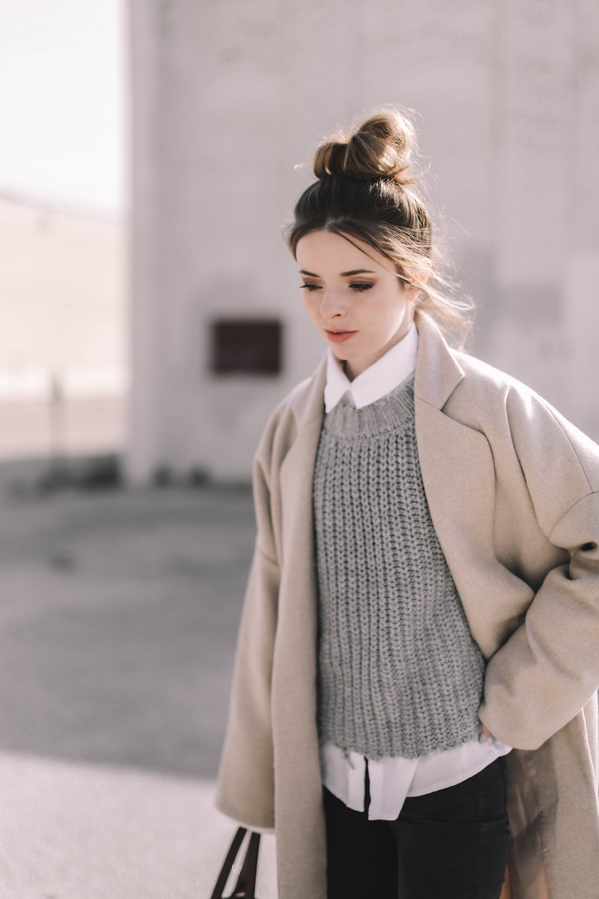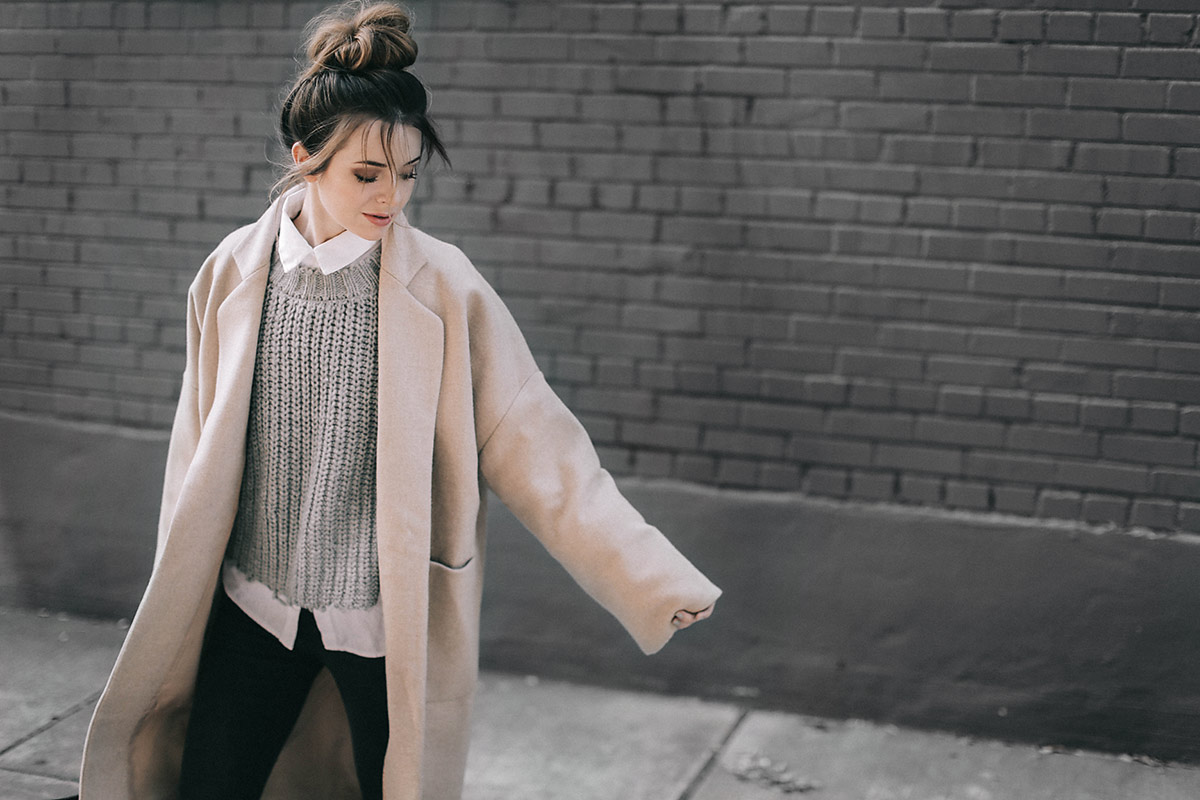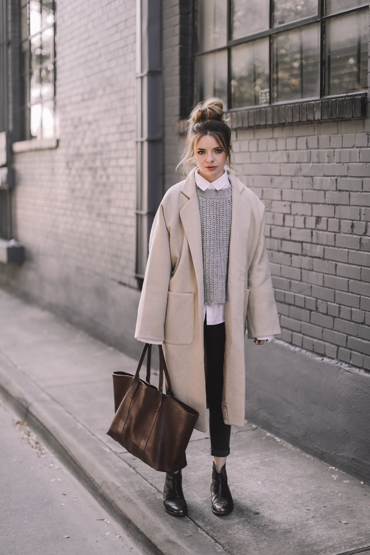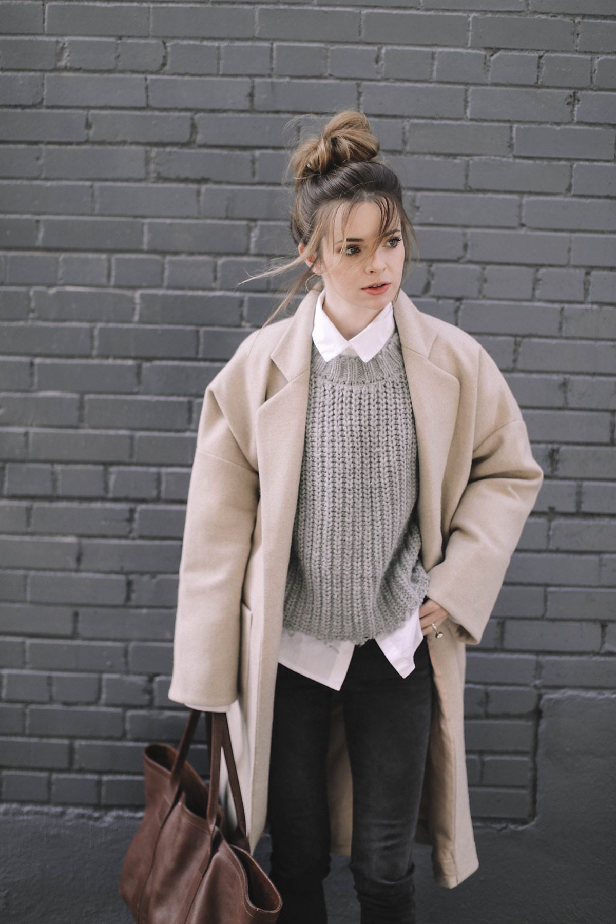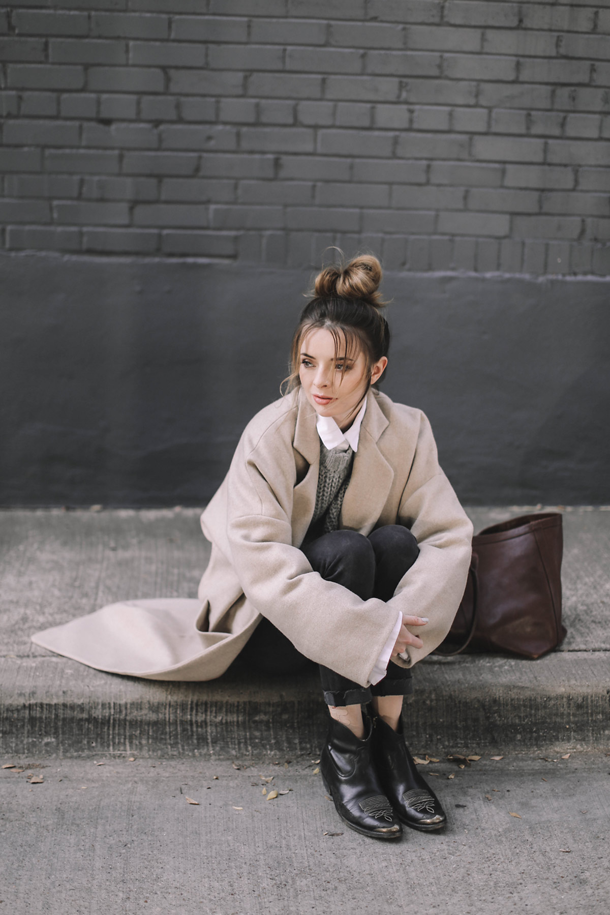 I am so in love with my coat, it is definitely a piece I will wear for many years to come. It reminds me of a sweater coat my mom has. Its a cable knit grey cocoon cardigan by MaxMara and she’s had it for probably 12 years. My mom is always lending this sweater to my sister, or me, or our friends. We never know where it is but it always returns home. I remember being out at a bar one night and seeing the familiar grey sweater draped over someones shoulders from behind. I tapped their shoulder and it was one of my sister’s best friends and I laughed. It’s like the Sisterhood of the Traveling Sweater! You’ve seen this sweater on Sea of Shoes a dozen times if you are a longtime reader, it is endlessly versatile. I can think of a few outfits I’ve posted with it off the top of my head. When I think about investing in a coat, I want to have the same kind of relationship with it that I have with the Traveling MaxMara sweater. That to me is what an investment piece should do for your wardrobe.