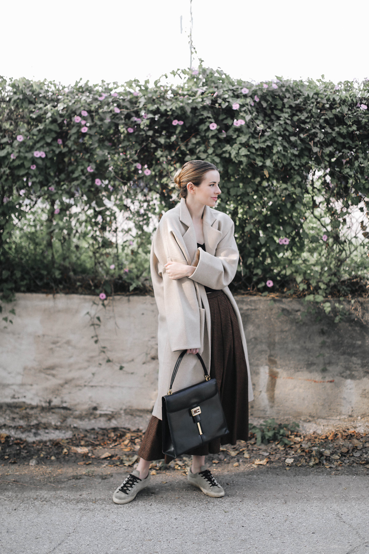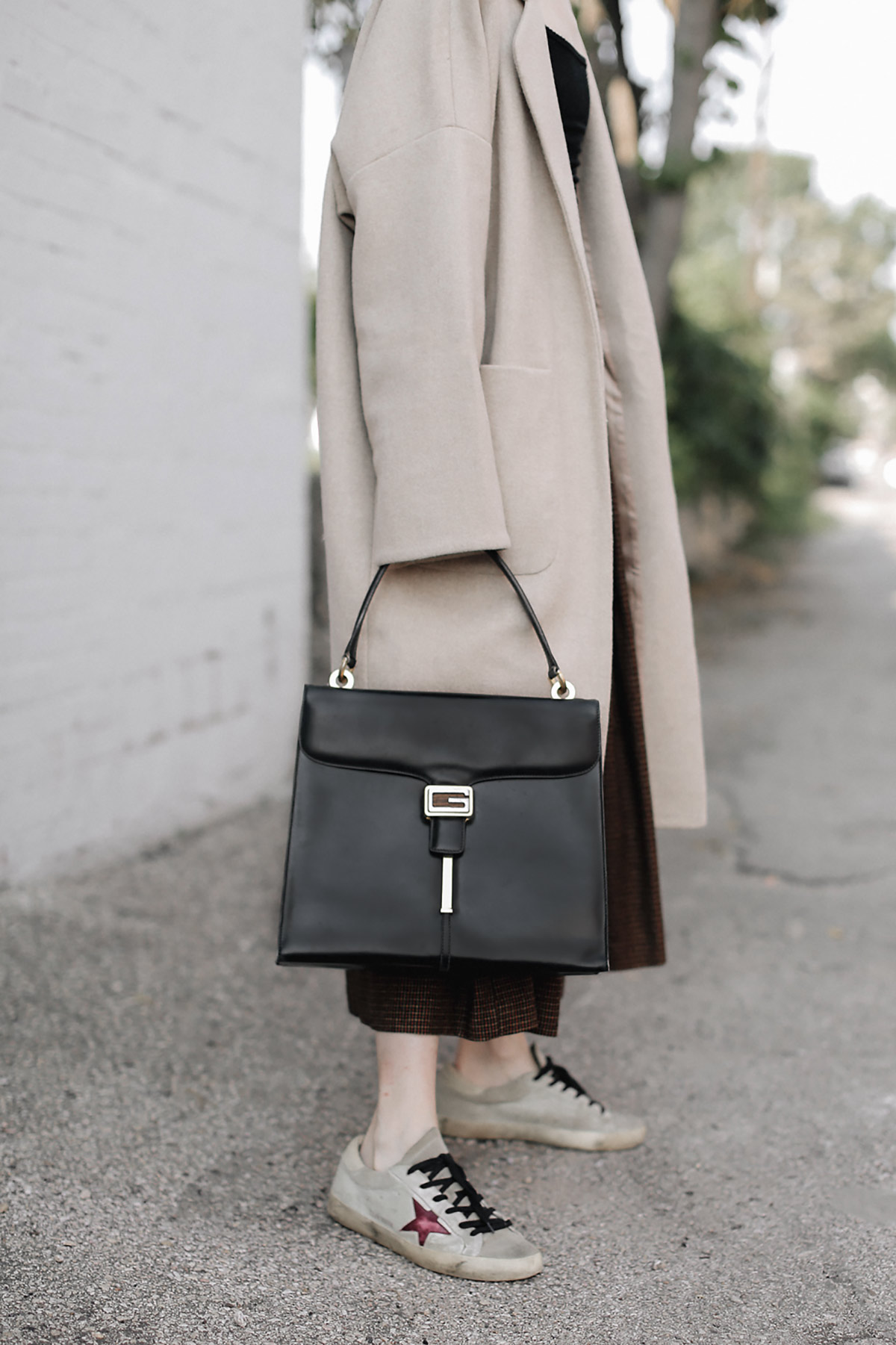 Second outfit I am wearing the Mara coat with vintage Perry Ellis culottes, vintage Gucci bag, and Golden Goose sneakers.