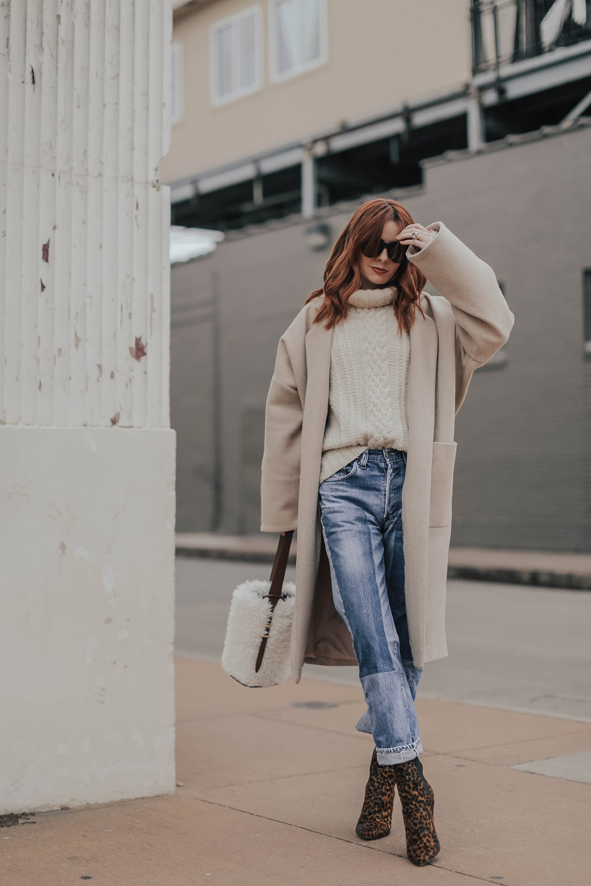 The bag I am carrying is a faux fur bucket bag I picked up on our honeymoon in Tokyo at a store called Life’s. For a similar look check out this faux fur bag, it is on sale for $86 right now! The leopard boots I am wearing are by Veronica Beard.