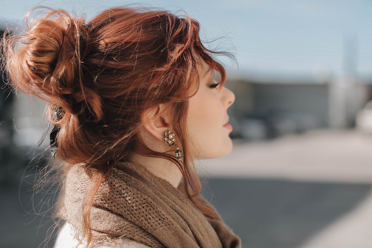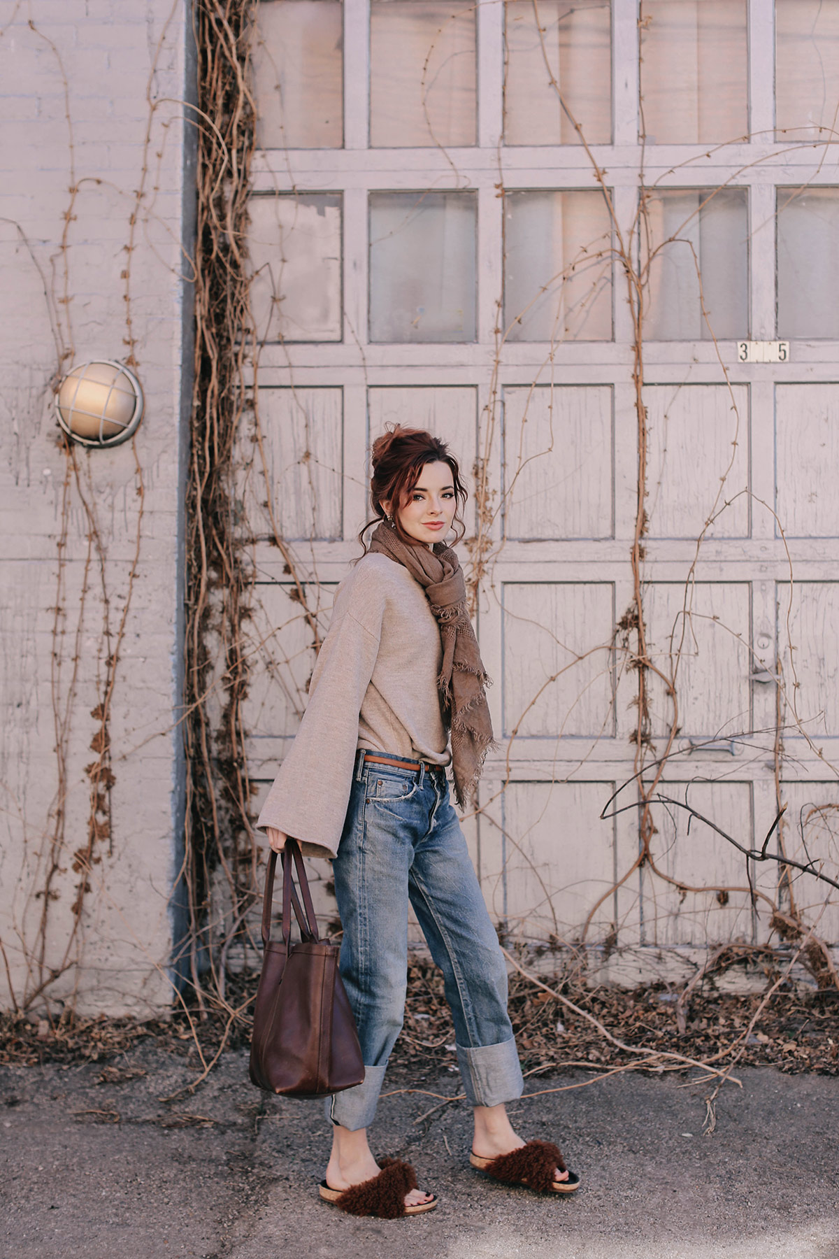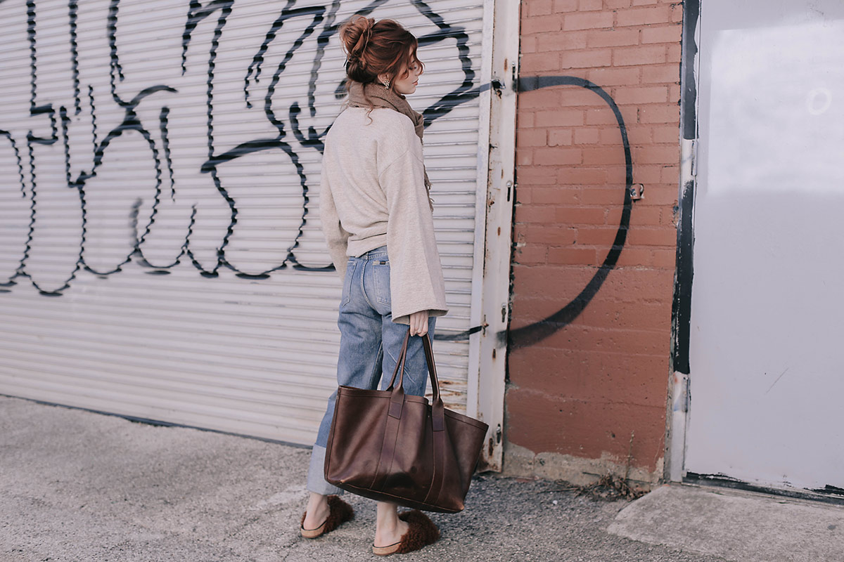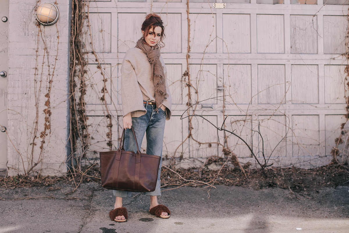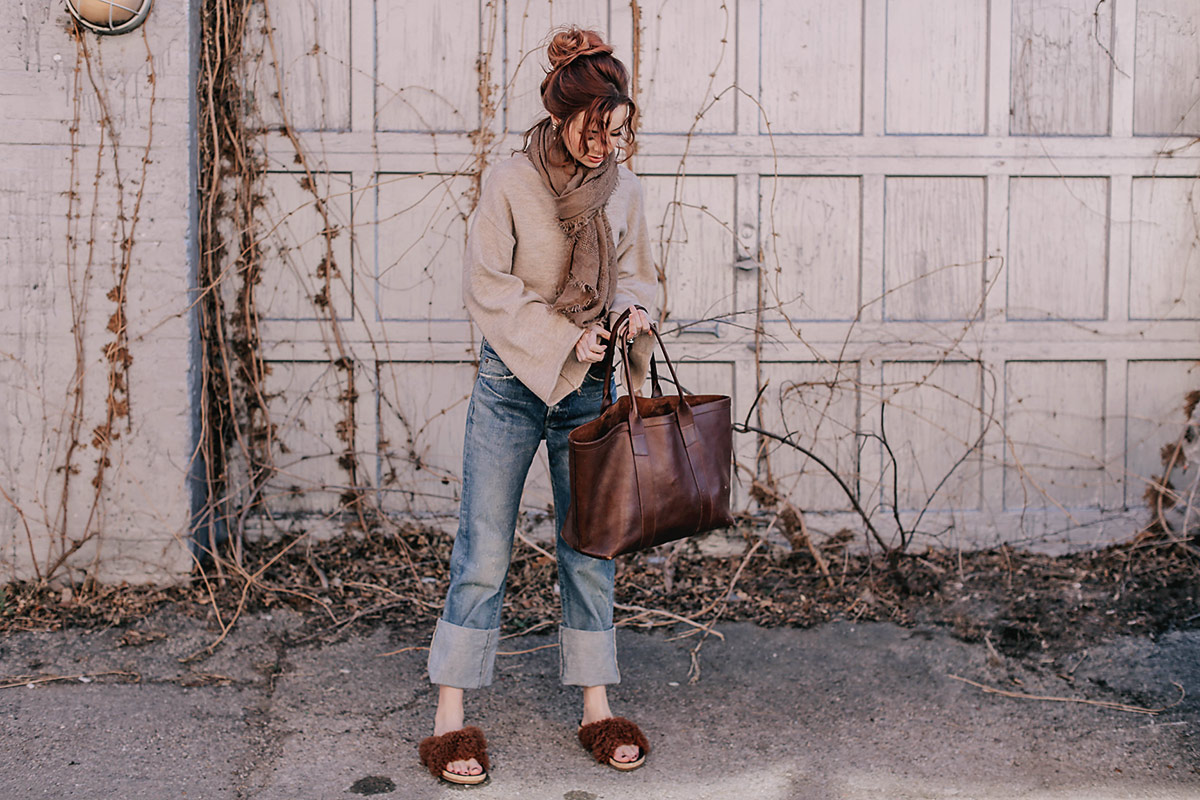 Wearing a sweater I honestly can’t remember where I got, Lotuff leather working tote, Chimala jeans, Chloe shearling sandals, and vintage earrings.