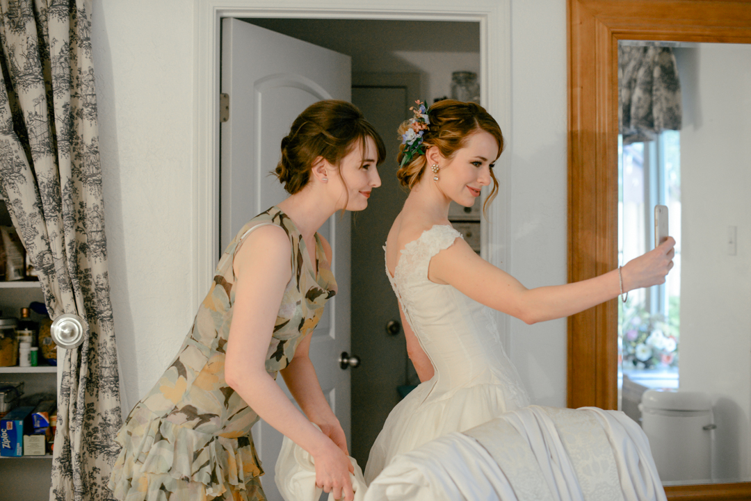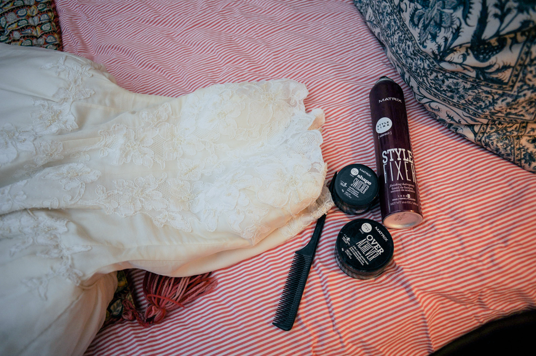 On the day of, the stylists arrived three hours before the wedding and I did my makeup myself while Danielle styled my hair. I chose to do my makeup myself because I actually find doing my makeup relaxing. I was keyed up in the hours before we walked down the aisle! It is pretty chaotic finding time to get ready in the midst of handling wedding details and making last minute decisions. Being tucked away with Matrix’s team in my mom’s bedroom with my sister, my best friends, and my mom helped calm my nerves considerably. It was a really special moment. My husband, my dad, and our officiant also got their hair done by Matrix’s team and the guys all loved getting their hair too.