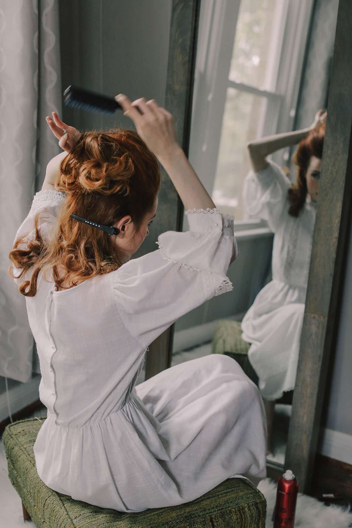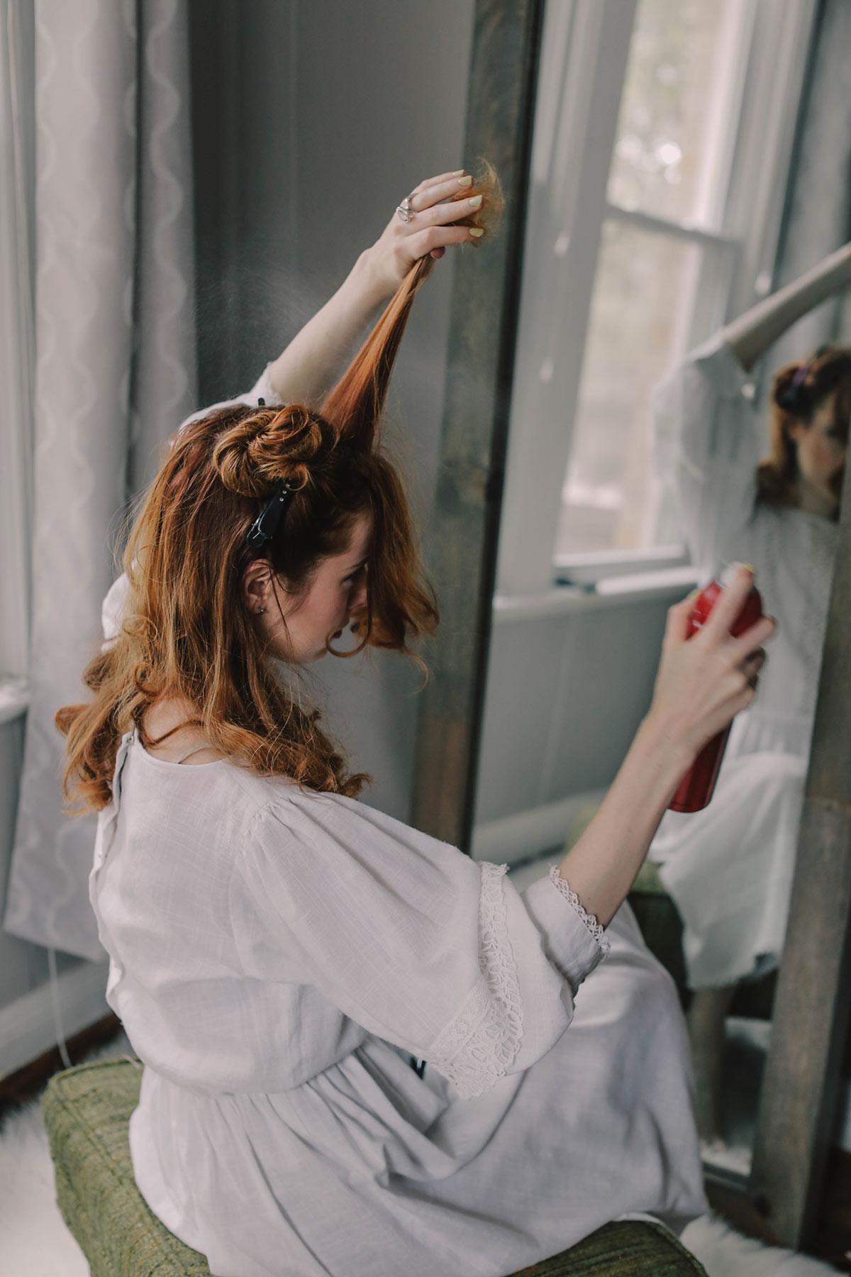 I’m going to tell you the real secret to this hairstyle before we get started. Once you get the curl and teasing into your hair, this hairstyle will come together very easily. Do not be afraid to really tease the heck out of your hair, it’s the secret sauce to this style!
