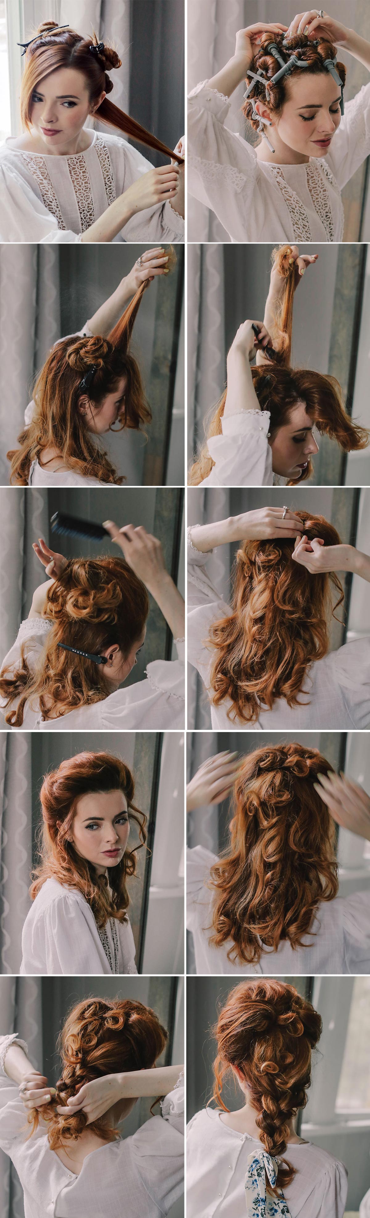 1. Start off with clean straight hair. You will need to set it in curls. The best way to do this in my opinion is with hot sticks (see above note). Comb your hair thoroughly. I separated my hair into a few sections with clips so I could put the curlers in one section at a time. It doesn’t particularly matter how you section off the hair, since this is all getting combed back into a braid later. To put in the hot sticks, grab 1 inch sections of hair, lift and comb the section straight, spritz the section with a mist of hairspray, and then wrap the ends of the hair around the hot stick, making sure you tuck all the ends underneath the roller as you roll. Roll all the way to the root of the hair, and then attach the ends of the hot stick together, pulling them tight so the roll sits close to the scalp. Repeat all over head.