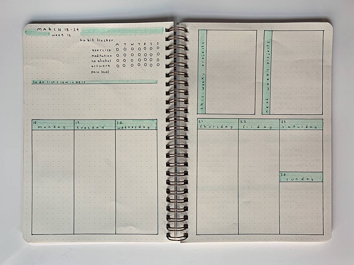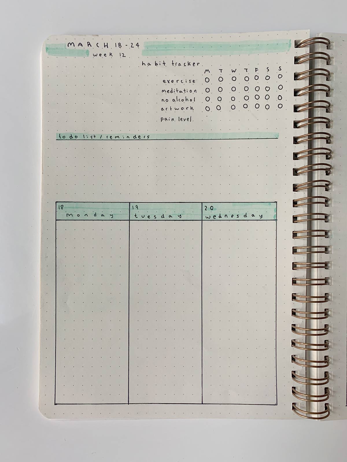 When I first started bullet journaling, I made my planner too complicated. I created a weekly planner that allotted space for meal planning, health tracking, and content planning. After much trial and error, I now use a simple two page weekly planner format that includes a bit of habit tracking, two categories for project planning (present and future projects), and a long vertical format to allow lots of space for notes and scheduling for weekly planning.