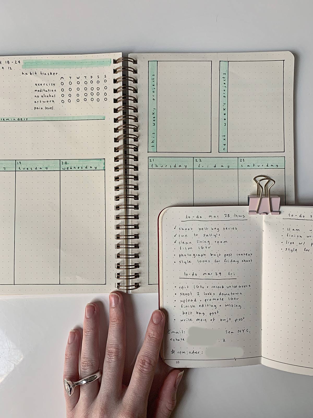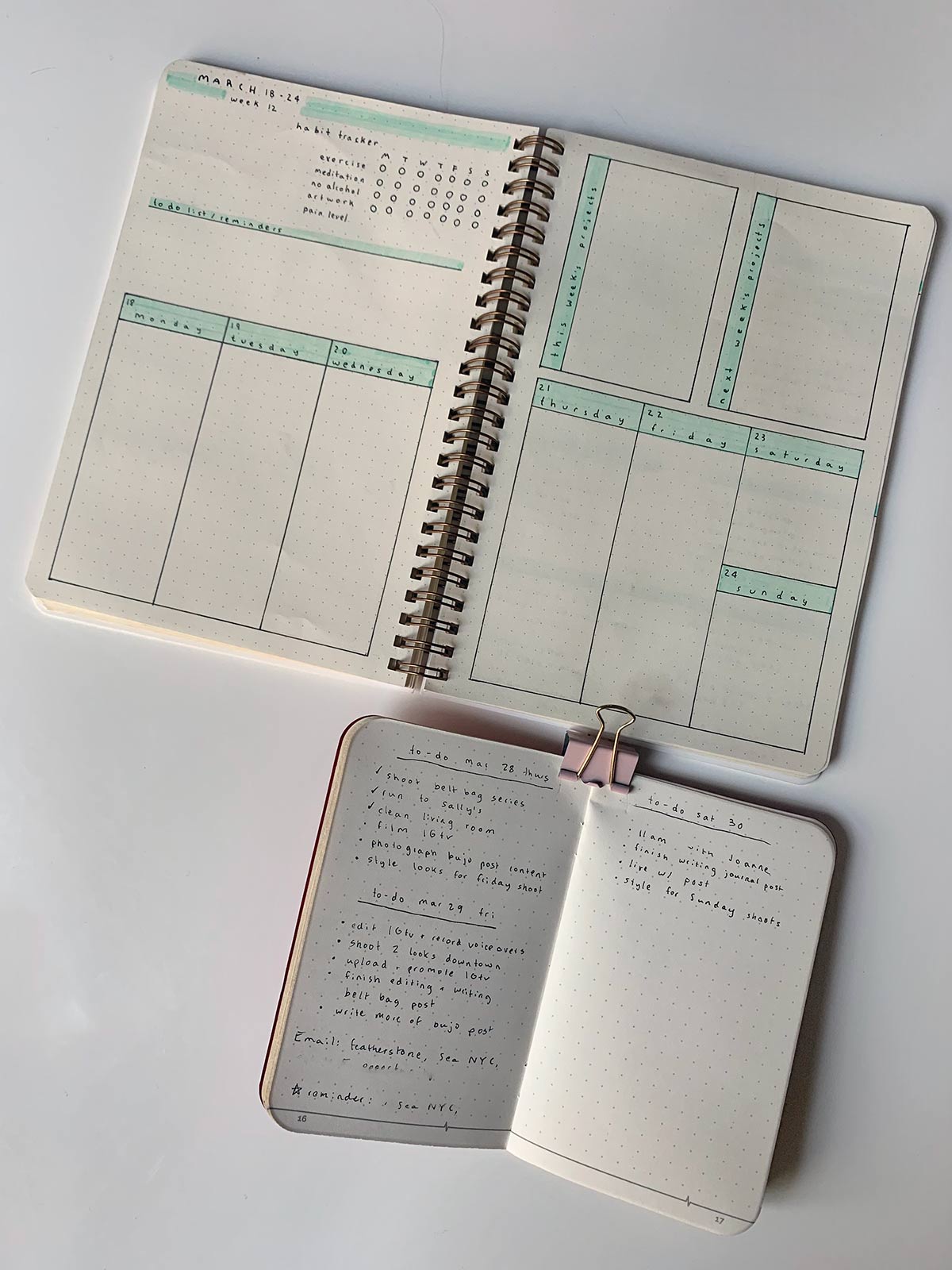 As a creative, my goals are often lofty and nebulous, and I juggle many of them at a time. If I fail to break each goal down into actionable steps on my to-do list, it is much less likely to get done. My mini to-do list allows me to schedule my day realistically. My weekly planner allows me to take a longer sighted view at my goals and ambitions for the week. I have found that having both is absolutely necessary, and I keep my mini journal in my bag with me always. I have finally settled on this system as the one that works for me!