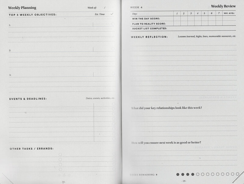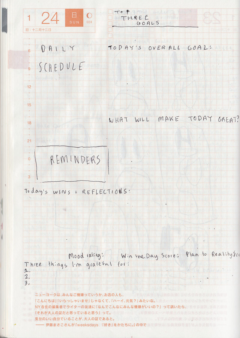 Best Self has a weekly planning and weekly review section, and I do this in a separate notebook every week (I use a Midori A5 grid notebook, it’s my favorite for note keeping and idea development). It helps clarify my goals before I lay them out in my Hobinichi weekly spreads.