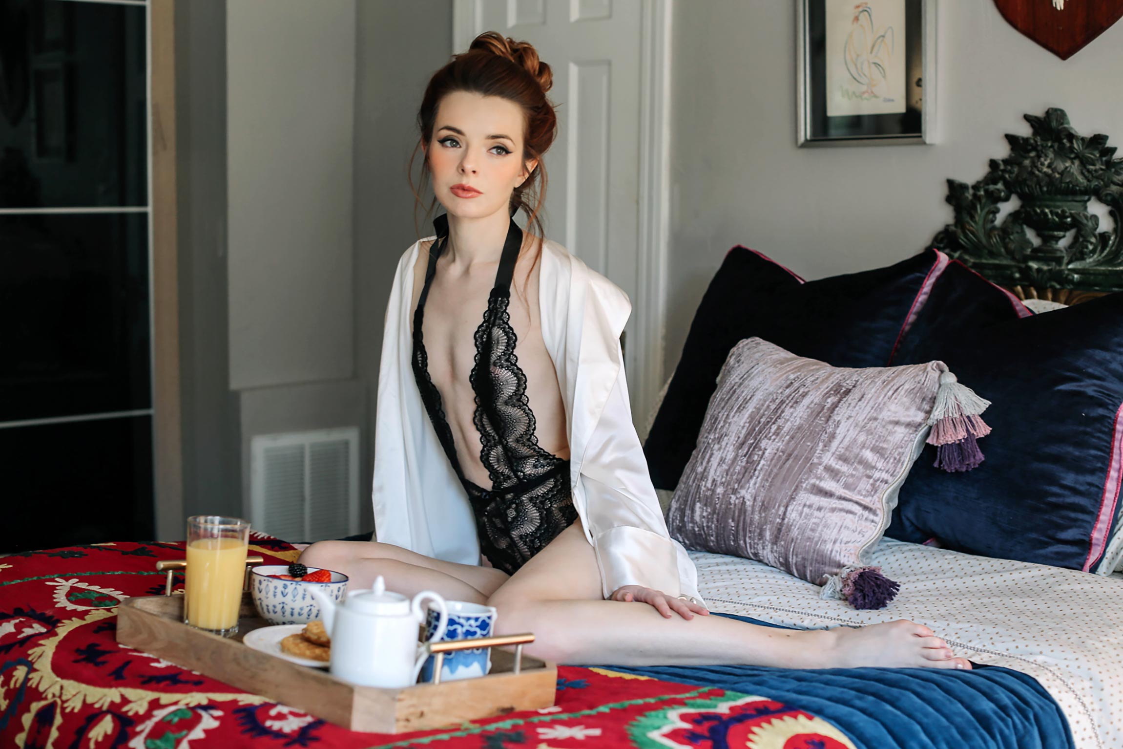 One of the obvious lingerie choices for small busted women who struggle to fit into bras…is to opt for non-bra style instead! I love having silk slips and robes (like this beautiful robe) for lounging and setting a mood. Something I’ve been loving are the halter teddies that have become popular in the last few years. Here I am wearing the Natalia teddy by Journelle. Because of the adjustable tie back, you won’t have to worry about not filling anything out! I first got one of these from L’Agent by Agent Provocateur about three years and was really pleased with how much use I got out of it. It’s the perfect lingerie option for traveling, or days you feel like lounging in high style. Perfect breakfast in bed look, in my opinion!