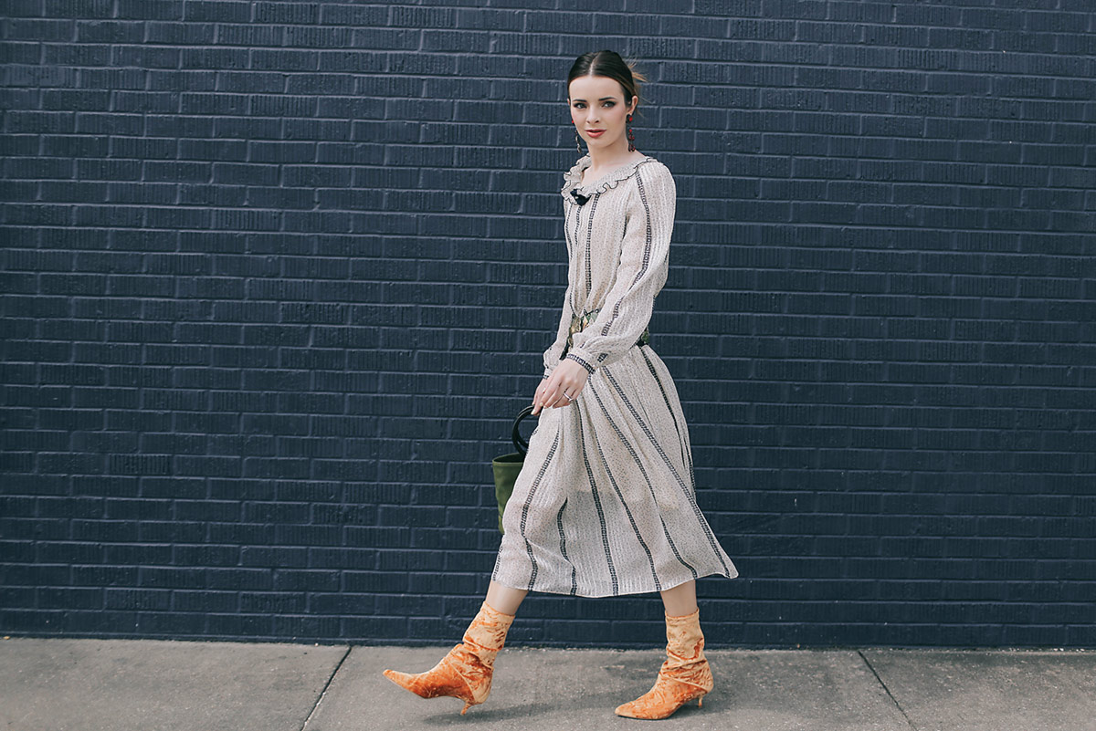 I knew I had to have these velvet Tibi boots when I first saw them a few months back. Crushed velvet acid orange kitten heel boots? Sounds right up my alley. I ordered them as soon as they became available and they were everything I hoped they would be. I own so many weird 70s and 80s kooky granny dresses and these boots are the perfect juxtaposition for styling them. I also love these with cropped frayed flare jeans and rock tees with an oversized blazer. I threw them on with some dangly earrings and an old favorite vintage dress for some wedding meetings on Monday.