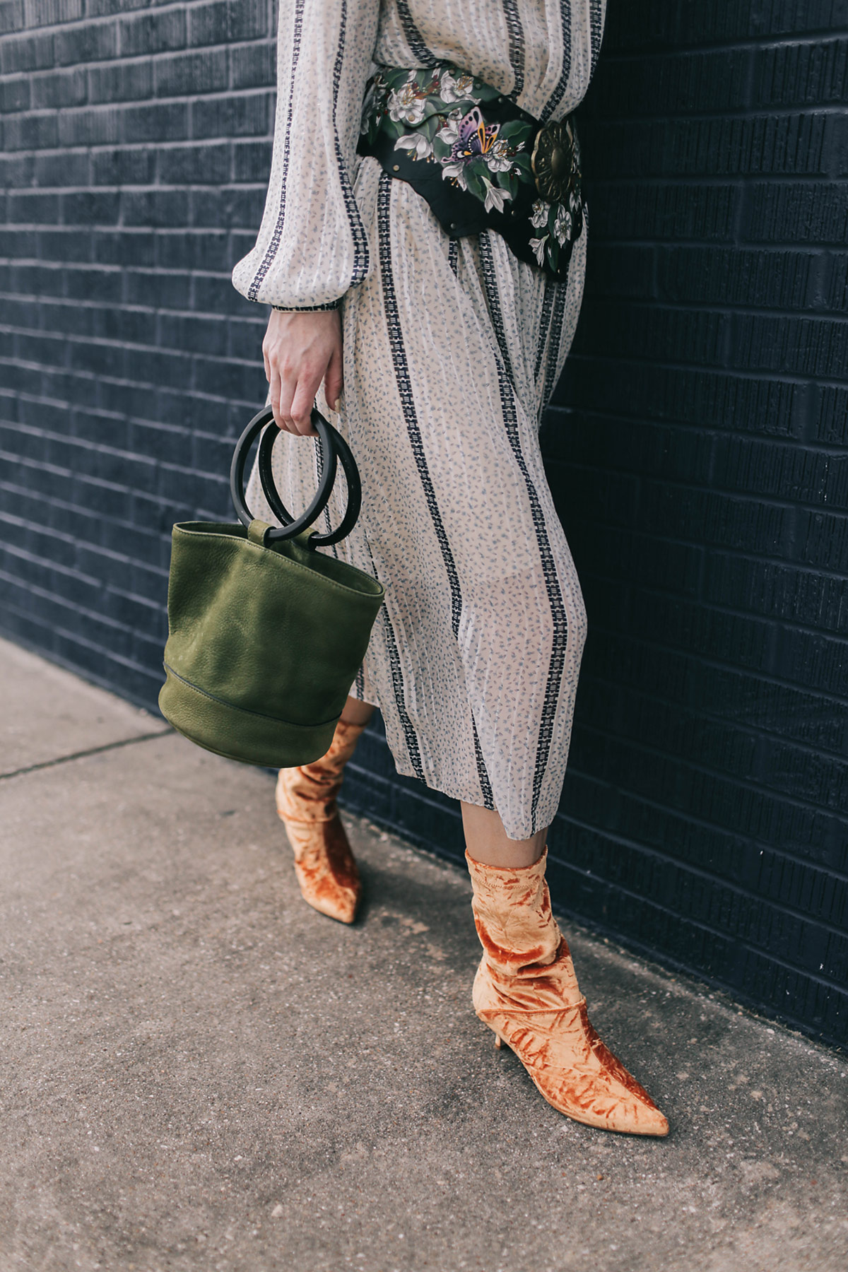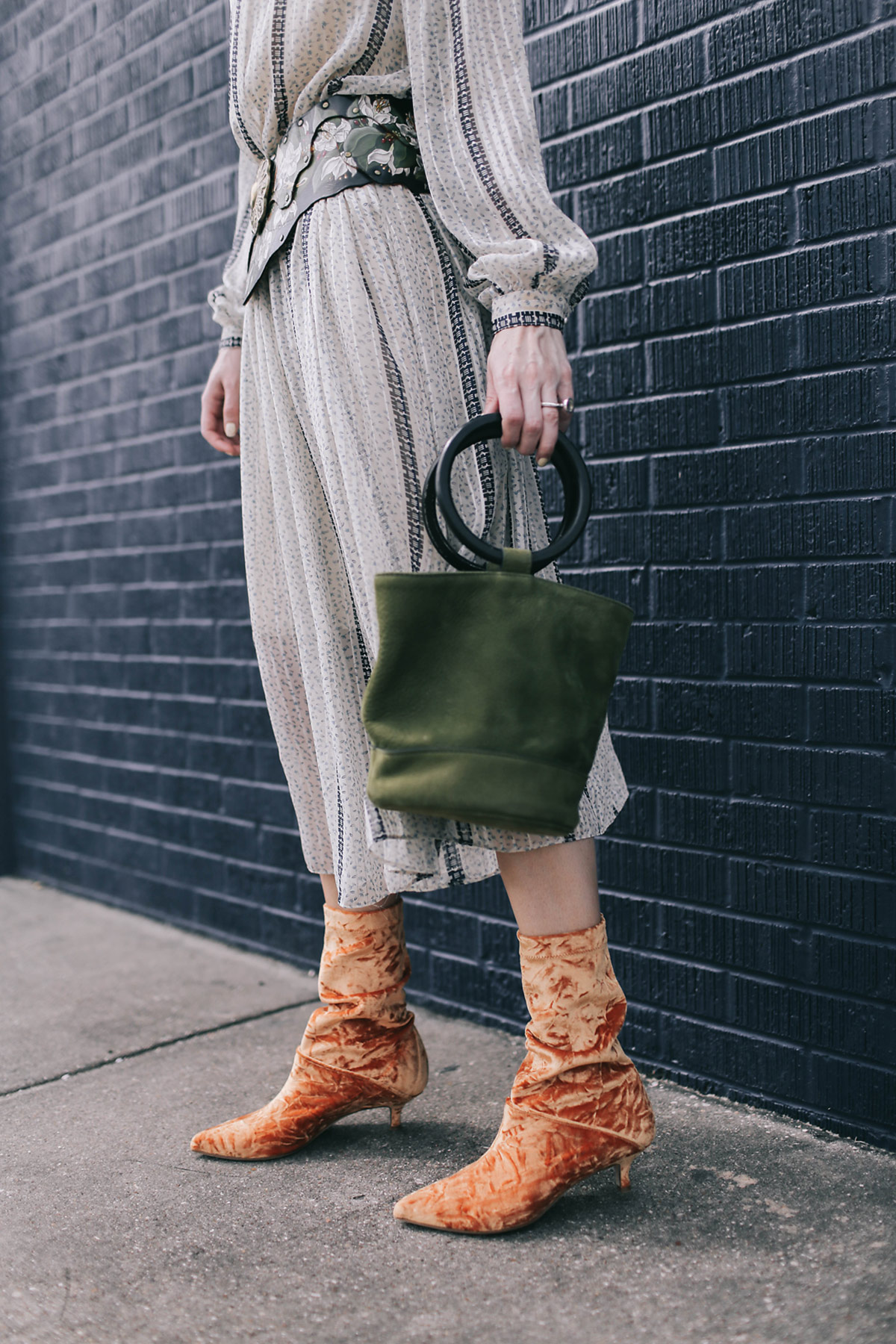 Wearing Tibi Harper velvet boots with a vintage Kay Unger dress with a vintage hand painted belt, chandelier earrings (similar here), and Simon Miller bag.