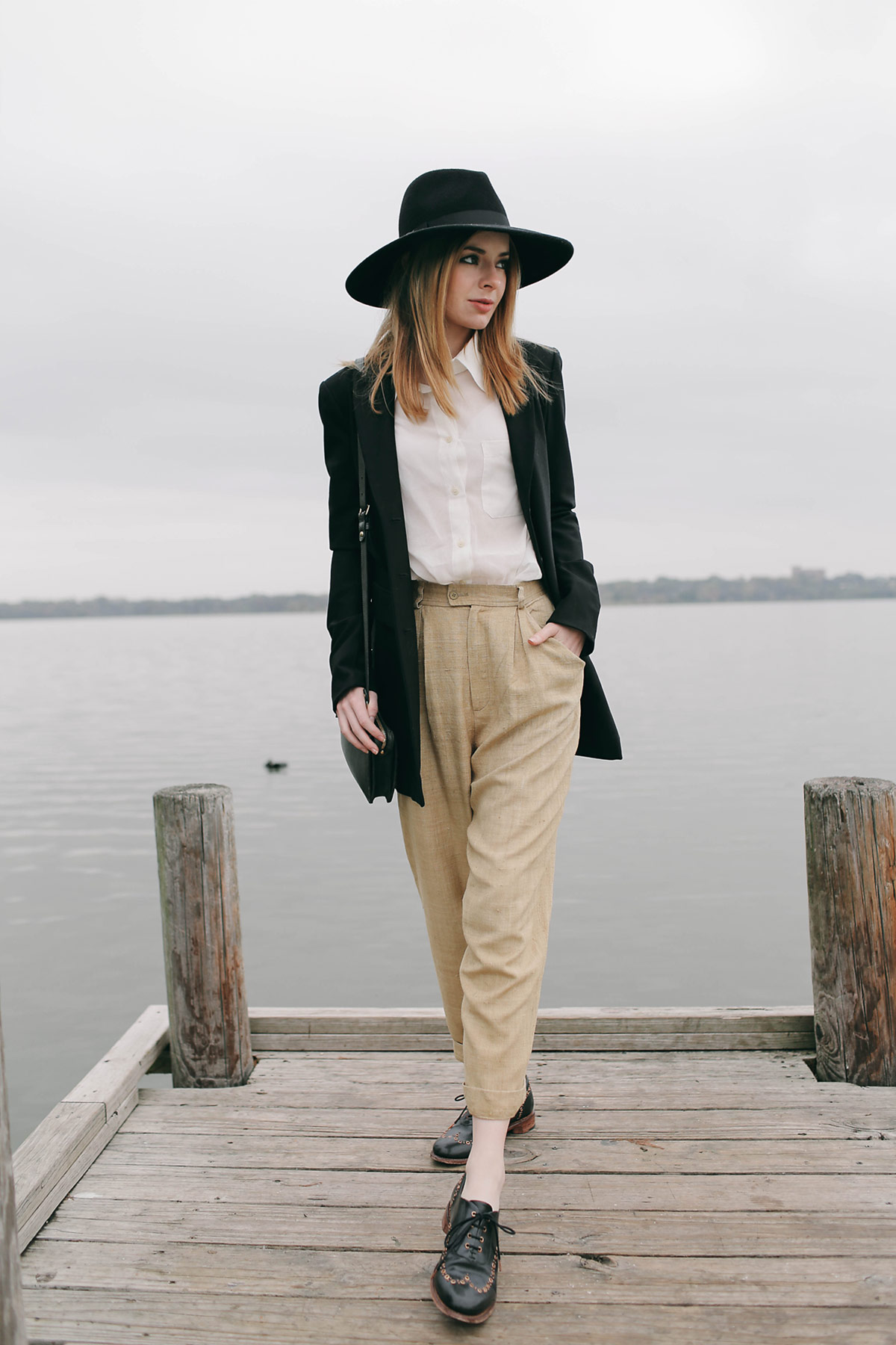 Here I’m wearing a longline blazer by the Row (no longer in store, I got it years ago but similar here) with vintage Yves Saint Laurent linen pants, vintage blouse, Club Monaco hat, and Office of Angela Scott brogues (maybe the most heavily featured shoe on Sea of Shoes this year?). If you are looking for a menswear inspired shoe for fall, look no further than Angela’s stylish brogues and boots. They are the best! I have worn these to death over the last few years and they look chic with everything.