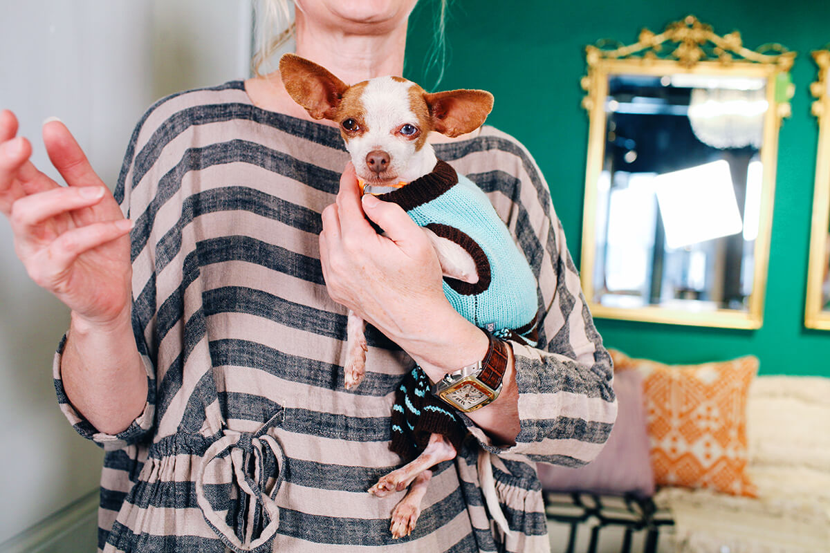 I had so much fun turning this into the fantasy studio apartment of my dreams. My mom and my sister provided their expert help and styling advice, we had way too much fun. I also should thank Megan (my mom’s latest rescue chihuahua pictured above), who never missed a day of work for the duration of this project. Now that it’s finished I wish I could move in! I love how the green walls turned out. I want to paint my living room the same color now. I love the black and white sofa against it! Thank you so much to Scout, Flann, and Miguel for this opportunity, it was a dream come true.