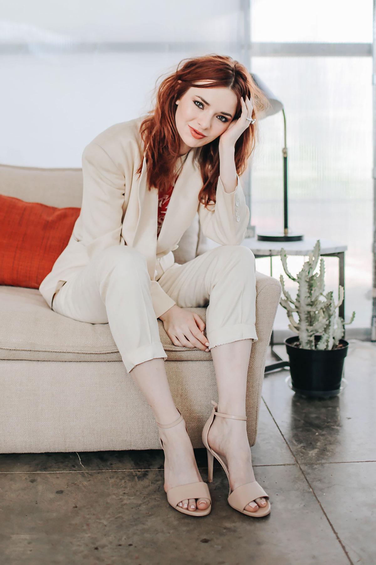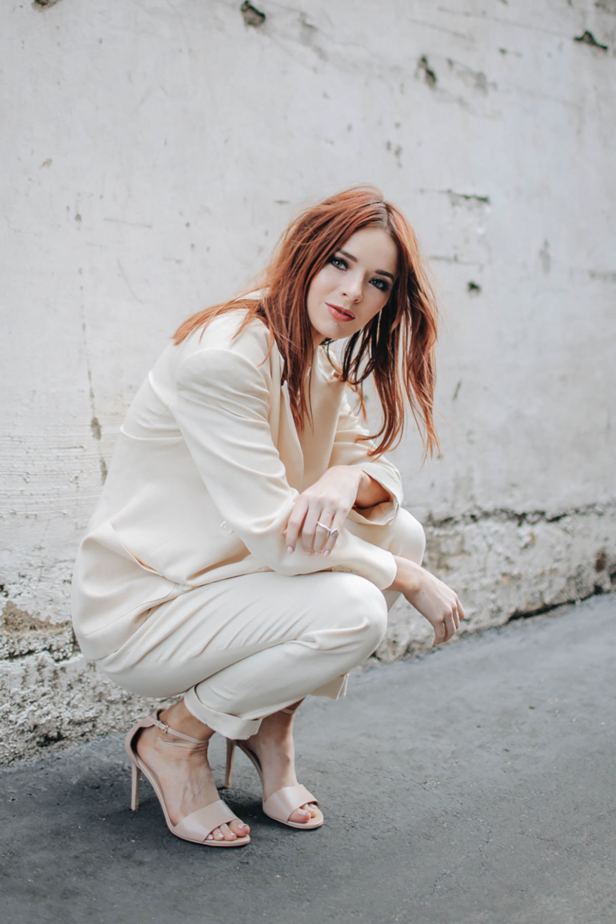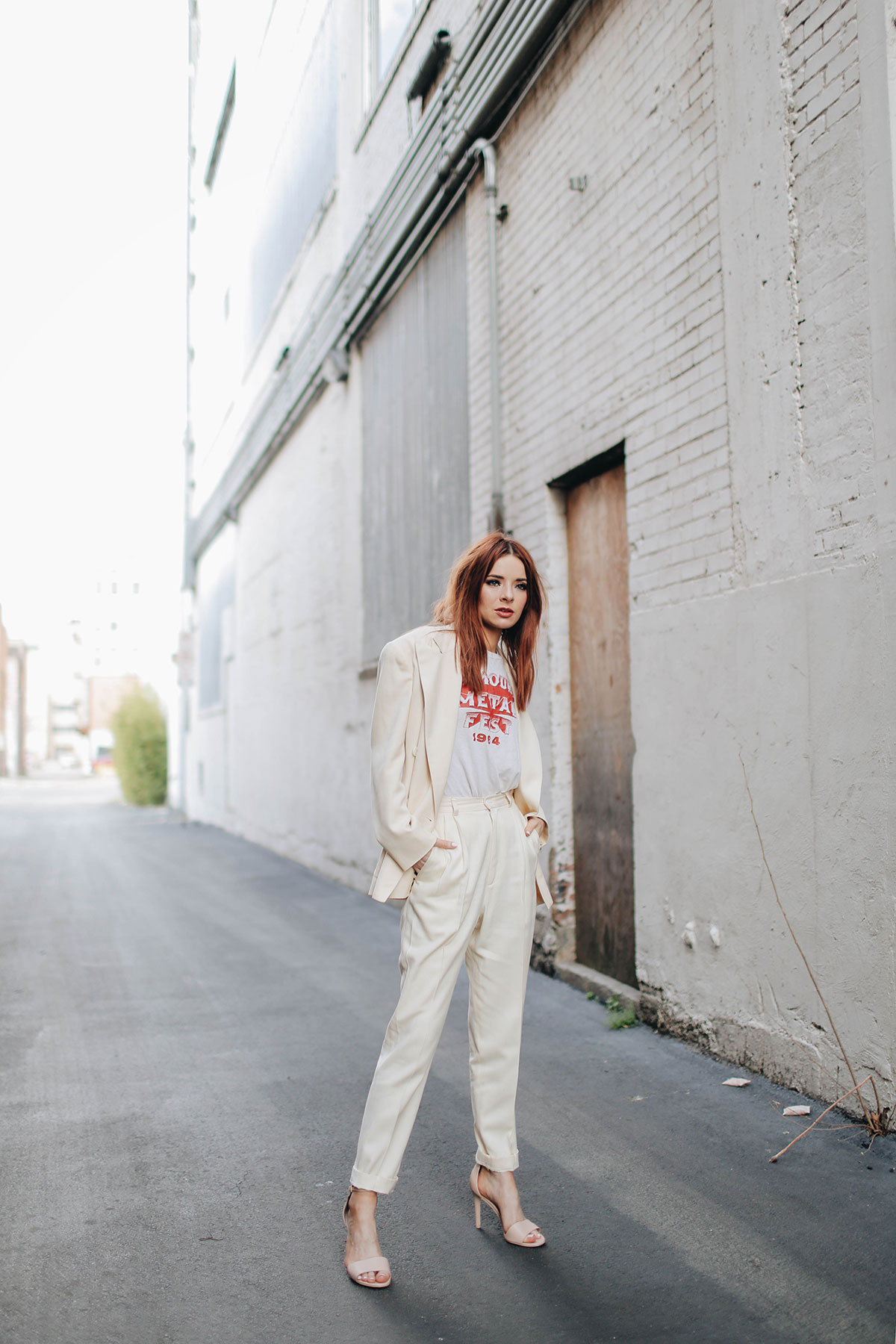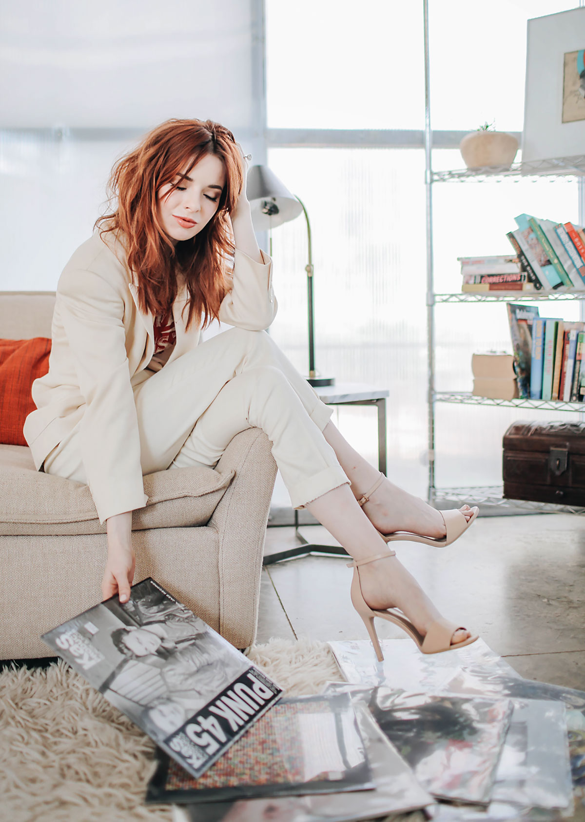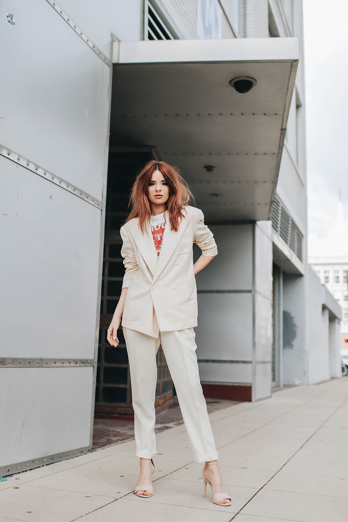 A good nude shoe is a must-have in my wardrobe, especially as the weather is warming up and I’m getting ready for summer. It’s a no-brainer, fail-safe shoe option for paring with neutrals. I love this Aldo sandal that’s available at DSW Designer Shoe Warehouse. I’m wearing it with a cream linen suit and a rock and roll tee. It makes a tomboy look sleek enough to wear for an evening out. I was so glad to find the perfect shoe to wear with my favorite suit. I also love nude shoes with miniskirts and dresses in the summer because they can give the illusion of mile long legs! It’s a styling trick you see a lot of celebrities using lately. No matter how you style them, it’s hard to go wrong with a classic sexy heel.