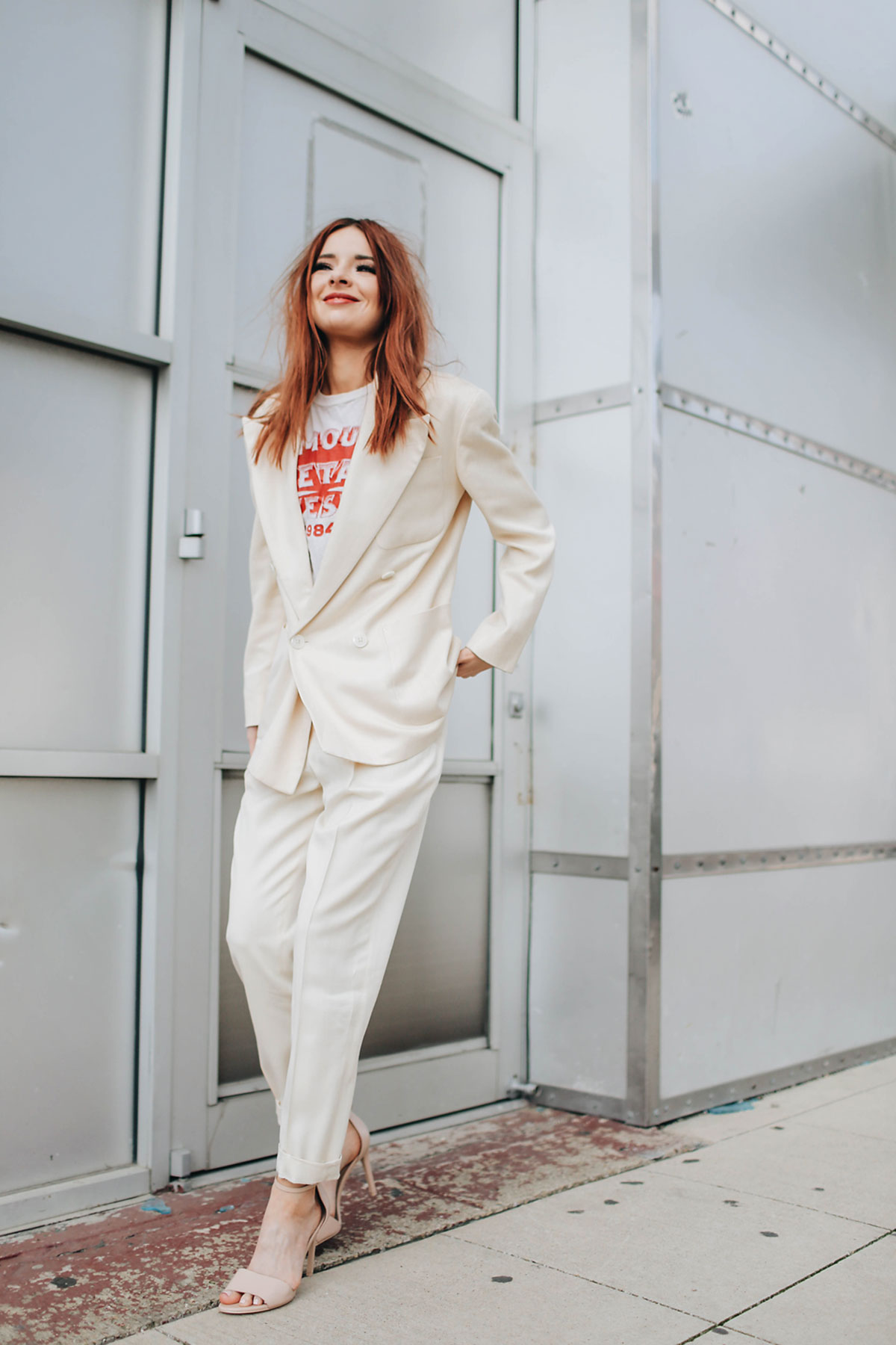 In my opinion it turned out a very harmonious combination of beige costume and shoes. Shoes do not stand out against the general background of the look, however they look very aesthetic and quite attractive.