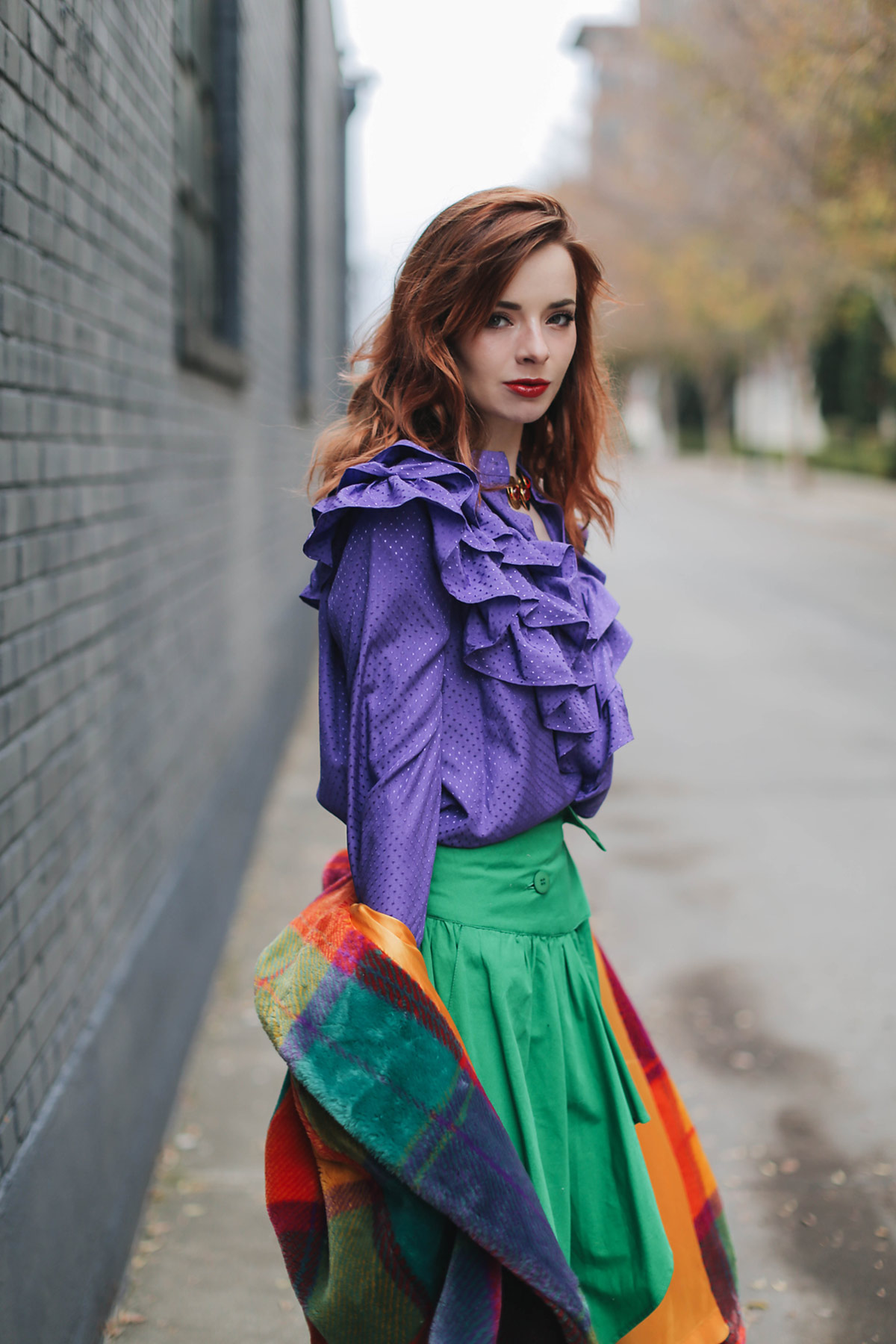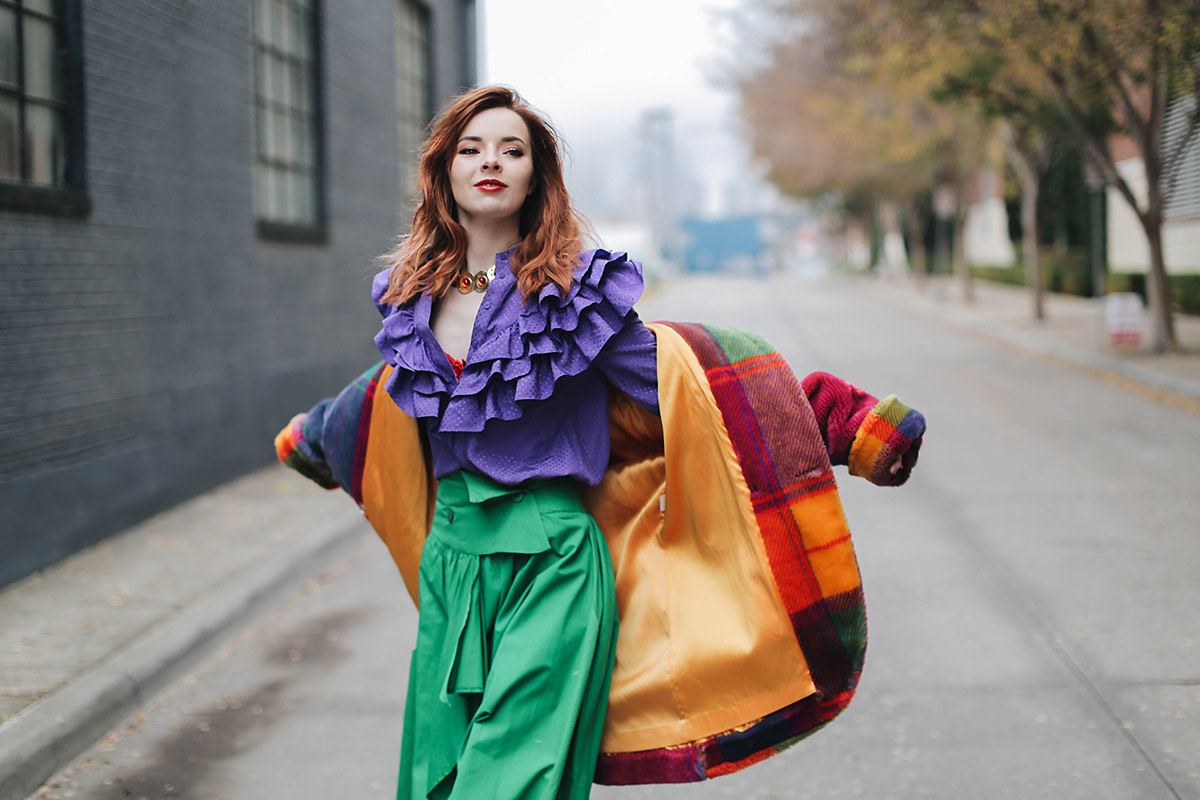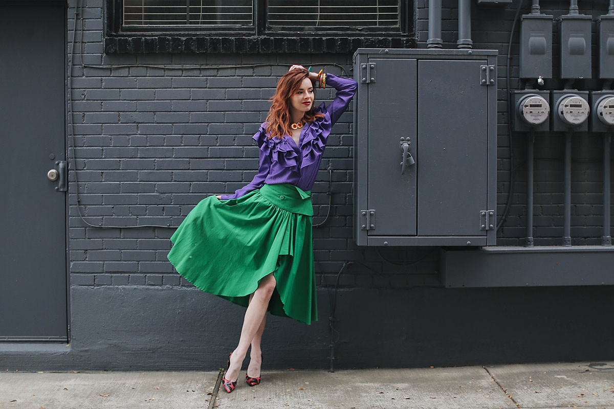 I picked up this blouse from & Other Stories while in Paris. My eyes were immediately drawn to the color. Purple is one of my favorite colors to wear and I loved the ruffle bib front. While dreaming up color palettes I knew that this purple blouse would pair fantastically with a vibrant kelly green. I got this 80’s skirt from one of my favorite vintage sellers over the summer. The purple and green made for a fun pairing. A red lace bra from Agent Provocateur was a cheeky way to bring in some more color.