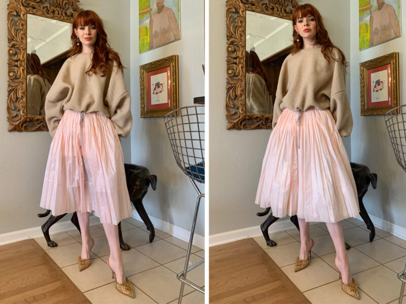 We tend to think of petticoats as something from a bygone era, and they’re certainly not something you ever see in stores anymore, but in my life and in my wardrobe they play a prominent role. They really make a difference for so many of my favorite outfits. I got many confused DMs last week when I posted myself wearing the Adidas ripstop skirt I have been talking about so much. “Why does your skirt look so different than the one on the website? It’s so floofy!” The answer to that question is petticoat magic! Pop a crinoline under that Adidas skirt and suddenly it starts looking pretty major. Petticoats have transformative powers, as I will demonstrate in this post. Read on below…