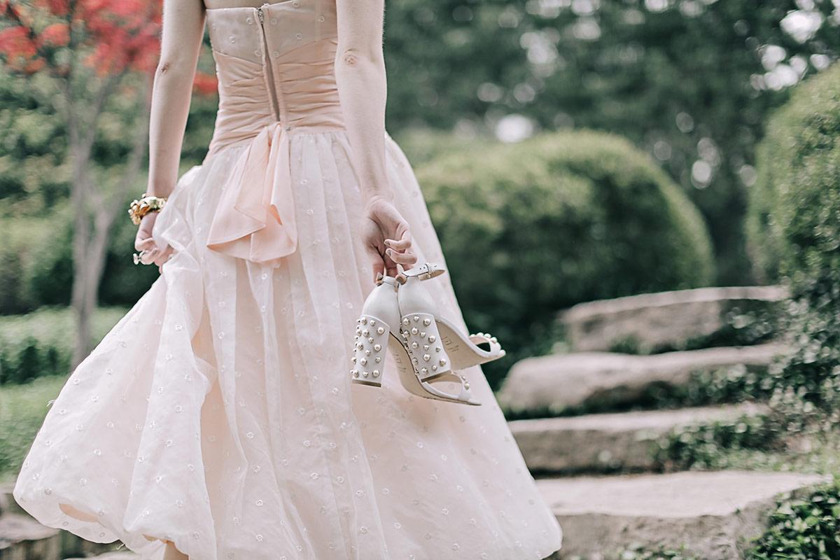 I fell in love with the Stuart Weitzman MOREPEARLS when I first saw them on Instagram…I now own them in both red and in white. The white MorePearls is part of Stuart Weitzman’s bridal collection and you can see it would make a stunning shoe for the big day! I love the view of this shoe from the back with the three dimensional pearl details. As a bride-to-be, I am in the mood for romantic white dresses. I’ve been considering this 50s strapless cocktail dress I’m wearing for the reception after the ceremony…it is such a dream come true with these shoes.