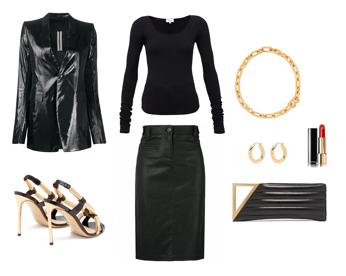 From what I understand, Jen is single at the moment. She may or may not be interested in dating, but it is her god-given right to look hot regardless. I think we heat up Jen’s look by looking towards a woman who has been fiercely sexy through her fifties and sixties…Carine Roitfeld. Her style never misses. Carine Roitfeld cut her hair on Instagram today with kitchen scissors, and it looked amazing, so my faith in her is stronger than ever before. Women of all ages look their spiciest in Carine’s signature uniform: sexy pencil skirts, sleek blouses, great heels, and a no-fucks-given attitude. I chose a Tom Ford biker pencil skirt, a Lemaire scoop neck shirt, and Rick Owens blazer.