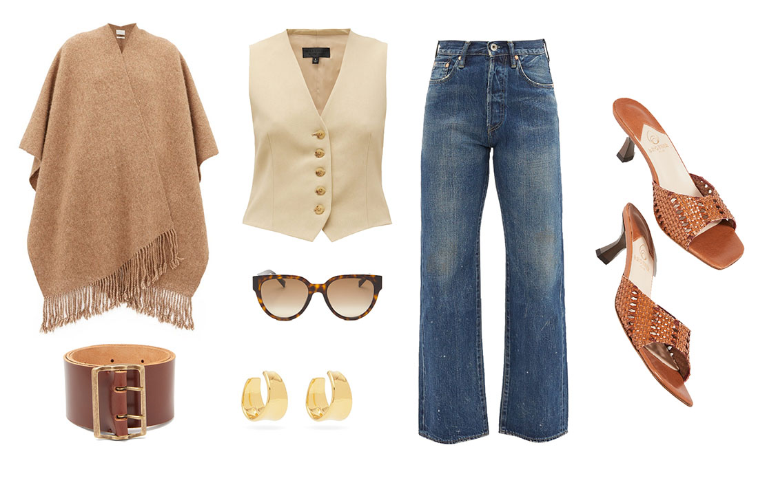 I would also buy a lot of shrunken vintage blazers and vests for her to wear with the jeans, like a Californian Annie Hall. I noticed in her candid outfits, Jen likes to wear a lot of loose cashmere cardigans, so I thought a stylish riff on that would be this really cool Lauren Manoogian shawl scarf. You could throw it on over anything.