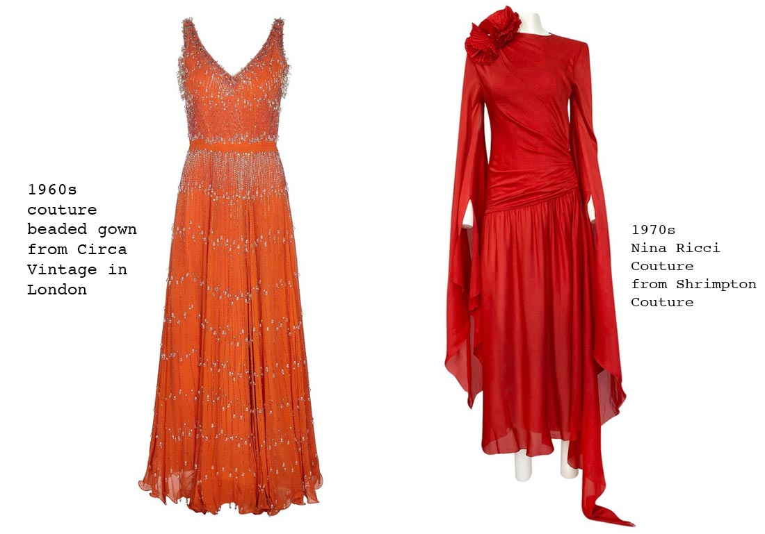 The 1960s crystal beaded orange gown from Circa Vintage on the left is an easy win for Jen. It’s dramatic and fun, and would bring some welcome old-school elegance to the red carpet. You never see dresses like this anymore, it reminds me of young Barbara Streisand at her most glamourous. This is a dress that is beautiful on its own but would be 10x better on the right person, and I think Jen would pull it off fantastically. Some great crystal bracelets and kitty-cat eyeliner would make this a million dollar look.