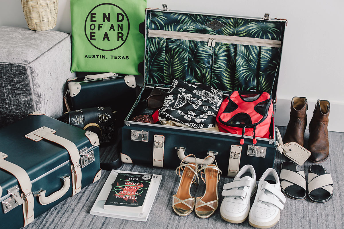 Have you ever had a suitcase break on you when you’re traveling? It’s a huge pain, and you’ll likely have to replace it with another crappy suitcase at the airport that is also bound to break in a year or two’s time. We recently made the move to Steamline luggage after months of admiring them from afar and it’s a worthy investment. The suitcases are extra durable and stylish. Just looking at them makes me happy and excited to leave for a trip. I love the tropical lining inside the Anthropologist set and the helpful compartments and protective hanging covers. They come with a nylon ripstop cover to protect the beautiful luggage when you are traveling, which you’ll definitely want to do if you have to check it. The carryon size was absolutely perfect for a weekend trip to Austin.