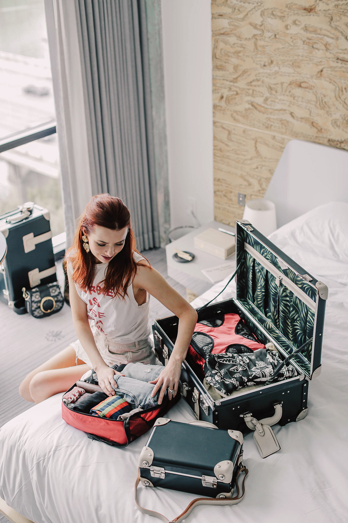If you are having trouble deciding what clothes to bring, lay out all of the clothes you are thinking about. Which ones “go together”? Pick a few shades you want to focus on and it will help you narrow your packing down while also helping you get the most outfit possibilities out of your travel wardrobe. I love pairing blue denim with crisp white blouses and tan leather shoes when I travel, so I always try to pack a few variations on this theme. Think of what you pack as a “capsule” wardrobe and try to pick an overall theme for your clothes. I did an Instastories series about a capsule travel wardrobe, go to my IG highlights to see it if you need some inspiration.