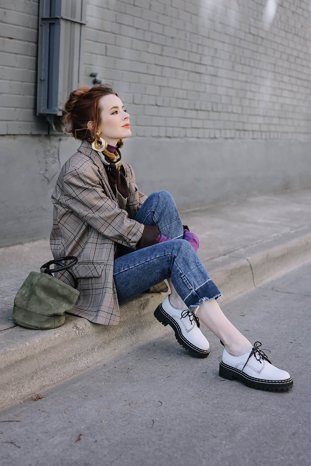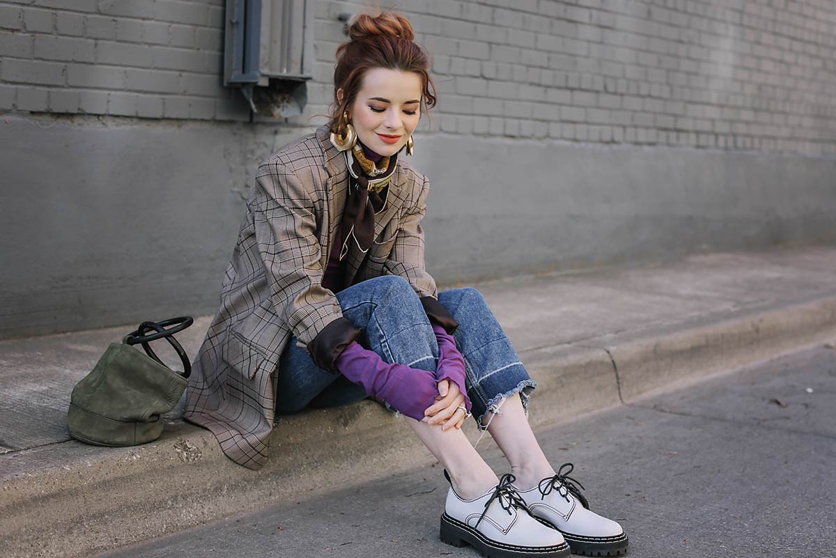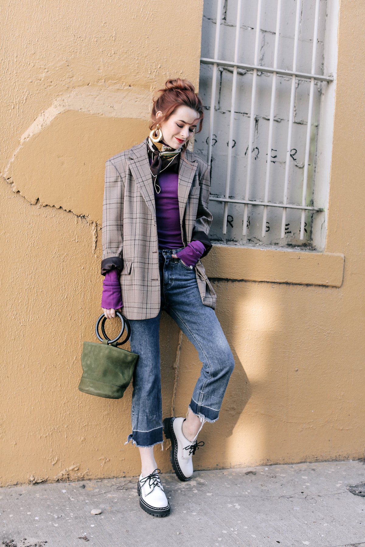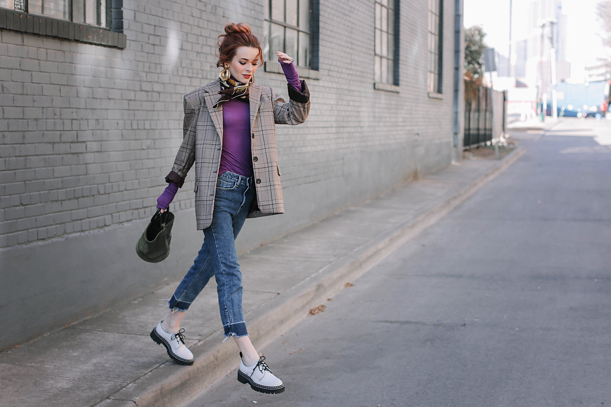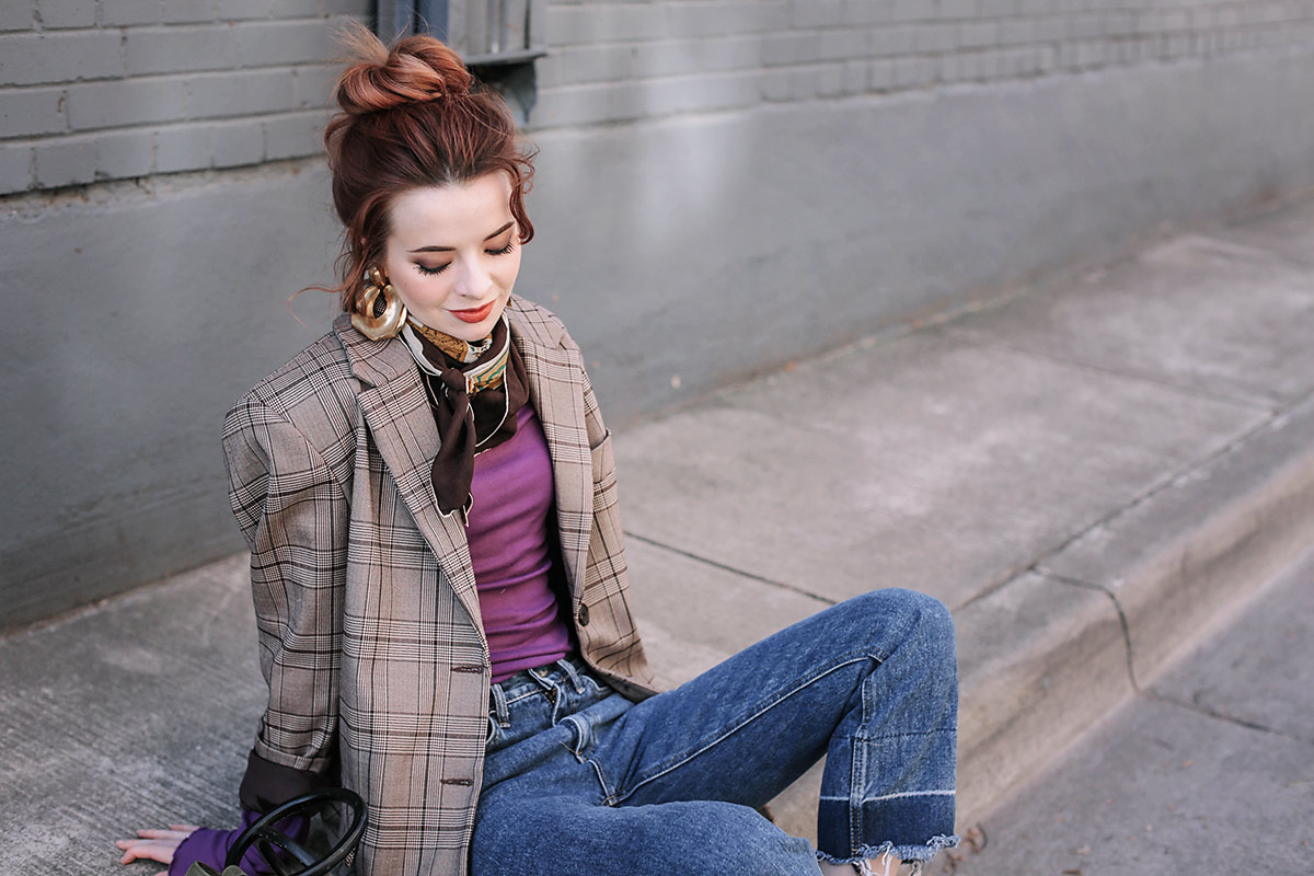 I love it, the bright violet next to the plaid is so fresh, with the statement earrings and scarf!You never seize to amaze me with the stunning outfits you put together, so inspiring.