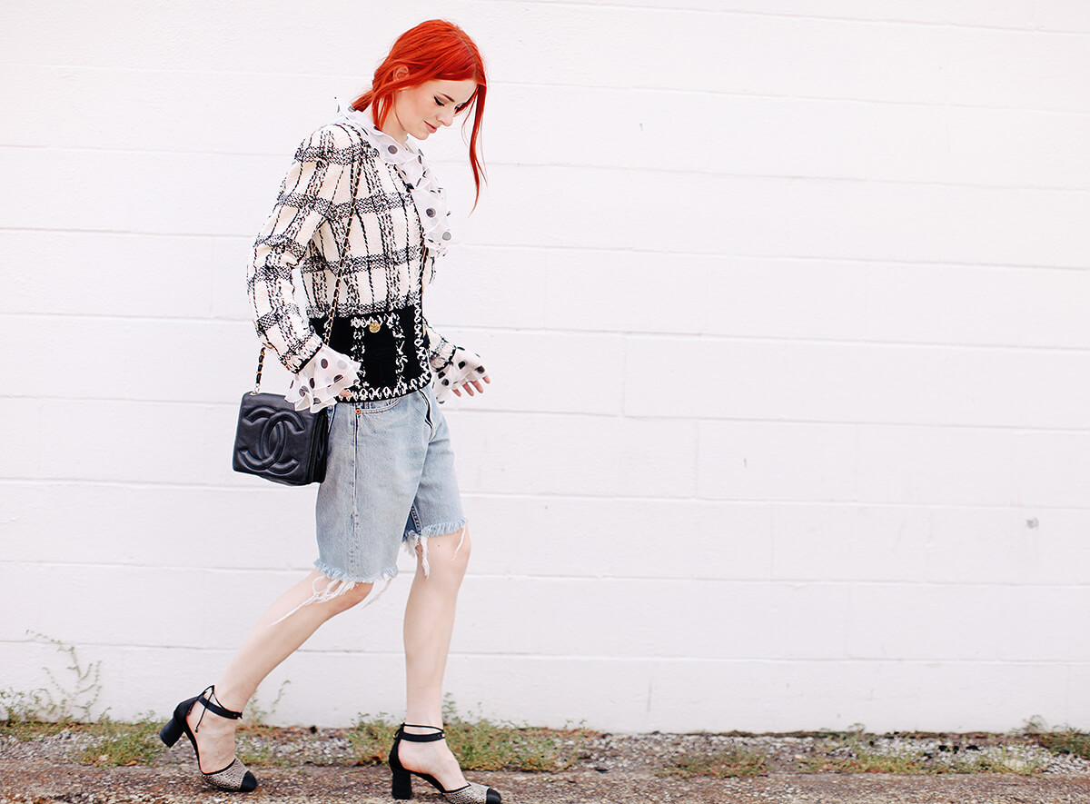 I do like these cut-off shorts lately. They were a good contrast to this very prim vintage Adolfo jacket. Such a favorite piece of vintage for me! I recently reorganized my closet and grouped all of my nubby vintage boucle jackets together. It makes me laugh because there is this huge chunk of my closet that looks like it belongs to Nancy Reagan. It’s a look I love though and seeing them all together makes me so happy.