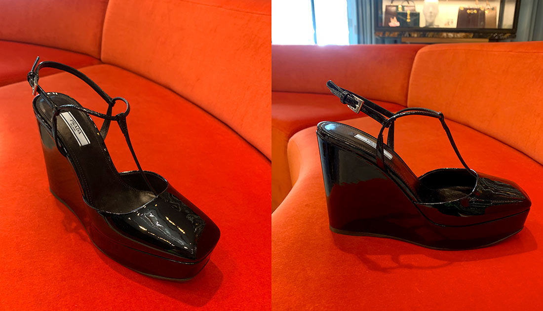 I was hovering around the shoe section of a department store one day, barely motivated to even take a peek at the offerings. That’s a sign of dire times for a shoe enthusiast! I gave the room a once-over. I saw a lot of pumps with gaudy embellishments (trying to hide the fact that they were just plain old pumps). I saw many boring boots with loud logos. And then in the back…something black and shiny caught my eye. They were glorious black patent, with a square toe and a tall platform I might even describe as meaty. And yet on closer inspection of this hefty square toe shoe, I found a delicate t-strap that called to mind film noir vixens of the 1940s. The combination of fat platform, skinny straps, and shiny black leather had me entranced. Naturally, the shoe that had me captivated was Prada. I took the shoe off the display and set it on a red velvet couch nearby, admiring it’s contours and heft from every angle.